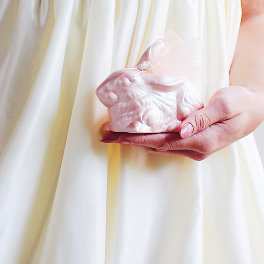 Vintage Pearl Pink Ceramic Rabbit - 1980s Kawaii Romantic Coquette Decor with Bow