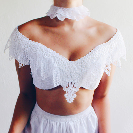 Reworked Vintage Bridal: Off the shoulder Lace Coquette cropped top / McClintock upcycled reversible reimagined dress