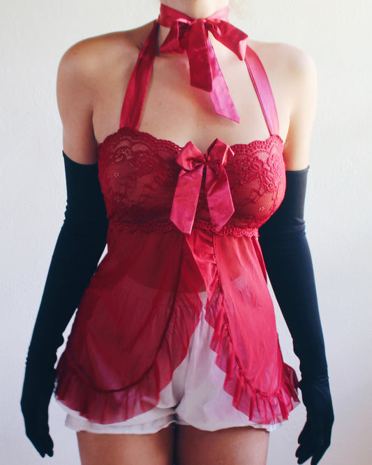Seductive Red Elegance: Lace and Ruffle Babydoll Camisole - Coquette Romance for Valentine's