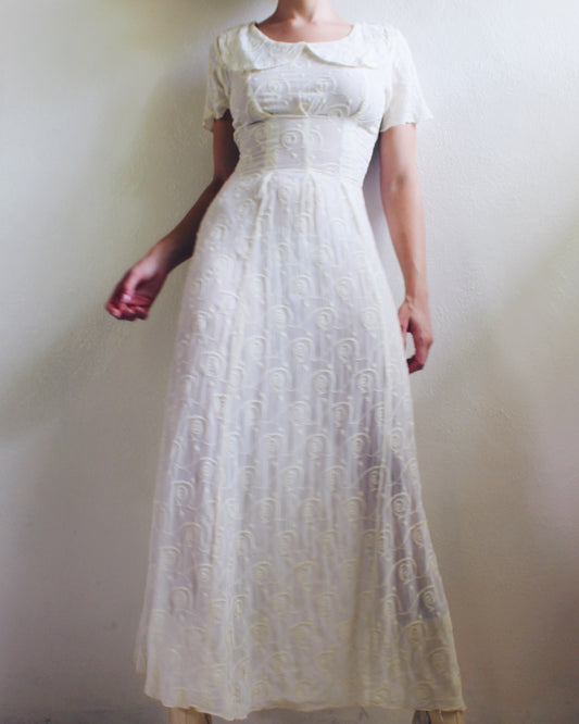 Sheer Cream Vintage Short Sleeve A-Line Prairie Dress - Bohemian American Gothic Style | Southern Cottagecore Scalloped Collar