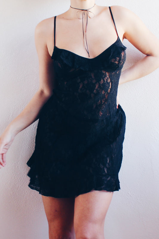Seductive Black Lace Sheer Mini Dress with Ruffled Bust | Coquette Romantic Style