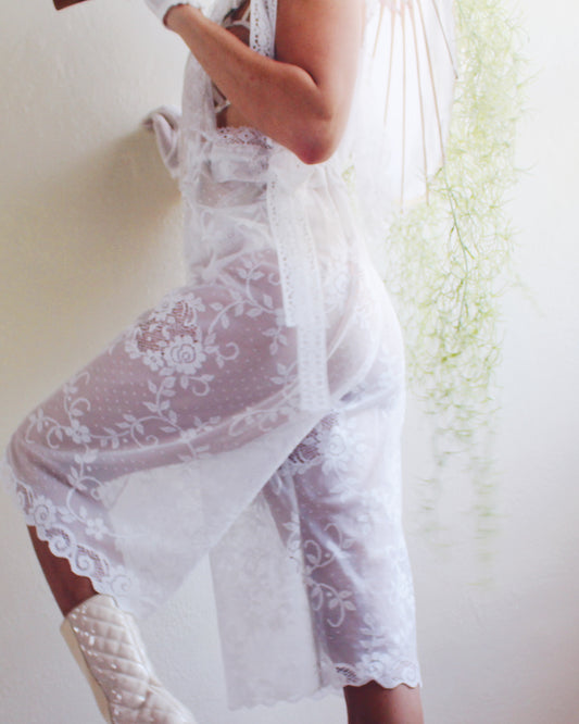 Upcycled Sheer Lace Overalls – Vintage White Curtain Reworked Dungarees | Whimsical Boho Summer Style