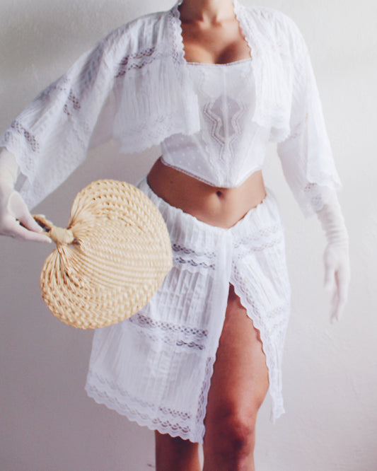 Upcycled White Cotton Skirt and Button Up Set with Lace Panels - Tropical Bohemian Style | Sustainable Fashion Made from Recycled Vintage