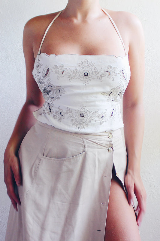 Upcycled vintage Place mat Tank / White cotton Reworked Fashion crop top / Floral Cross Stitch Cami Shirt