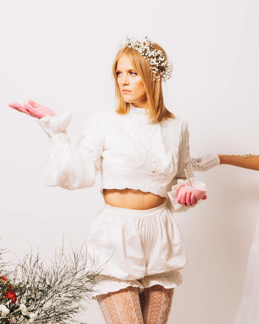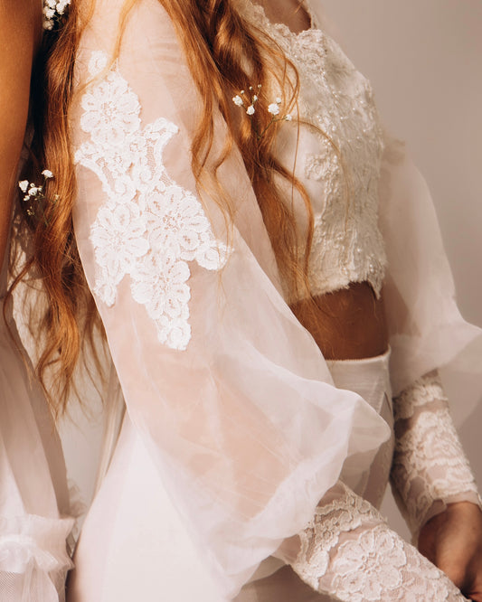 Upcycled White Lace Long Sleeve Cottagecore Crop Top - Reworked Vintage Wedding Gown | High Collar Edwardian Coquette Style with Ornate Sleeves
