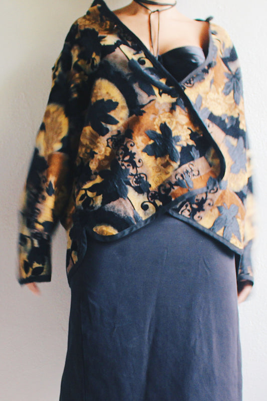 Vintage '90s Whimsigoth tapestry knit fall coat / Goblincore maple leaf tapestry cardigan jacket