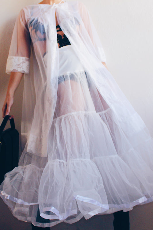 Victorian Whispers: Sheer White Lace Bed-Coat Robe for Dark Academic Dreams
