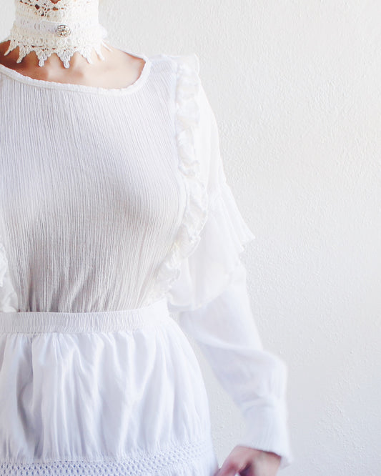 Vintage White Lace High Neck Victorian Midi Dress - Long Sleeve Coquette | American Gothic Prairie Wedding Dress