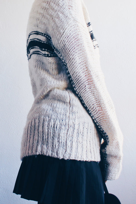 Academic Chic Elegance: Hand-Knit Cream Striped Turtleneck - Vintage Preppy Glam!