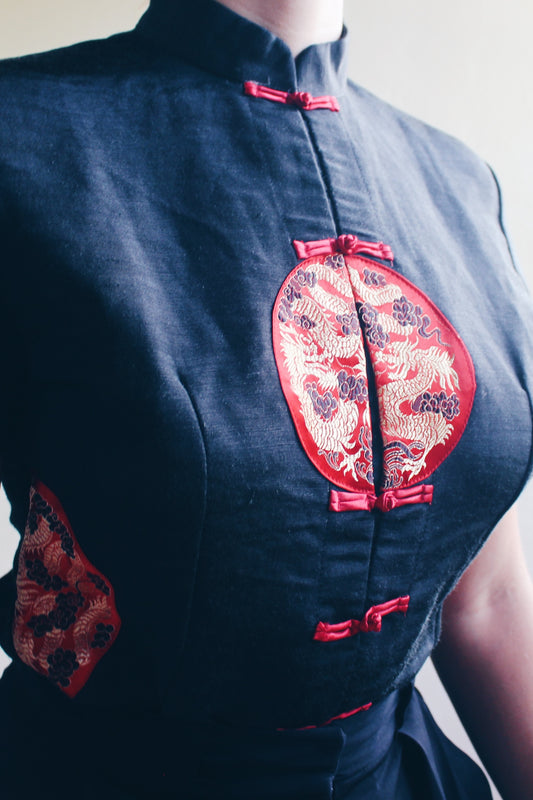 Black Chinese tunic / black red gold dragon shirt / linen silk cheongsam / 90s vintage top