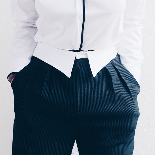 Androgynous Formal: Upcycled Black Pleated Shorts with Attached White Shirt Collar
