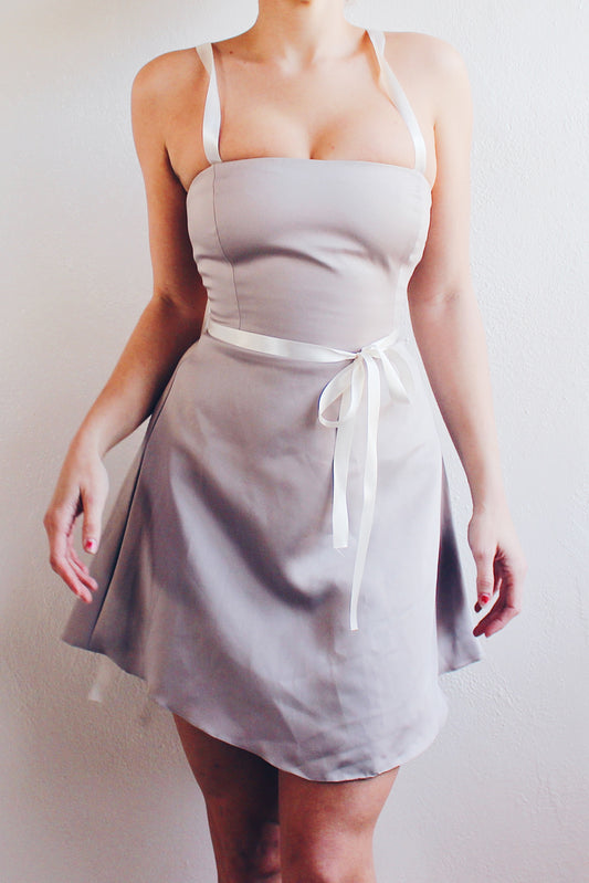 Vintage Chic Khaki-Grey Mini Dress - Form-Flattering Elegance with Upcycled Ribbon Details