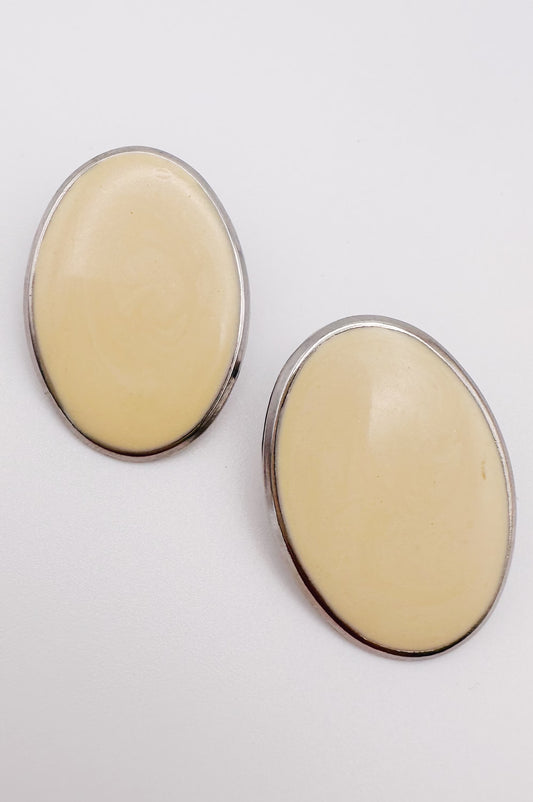 cream and silver oval stud earrings / 80s vintage minimalist earrings