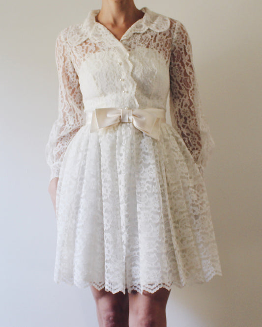 Vintage 60s–70s Cream Lace Mini Dress – Long Sleeve A-Line, Waist Bow, Coquette Retro Romance