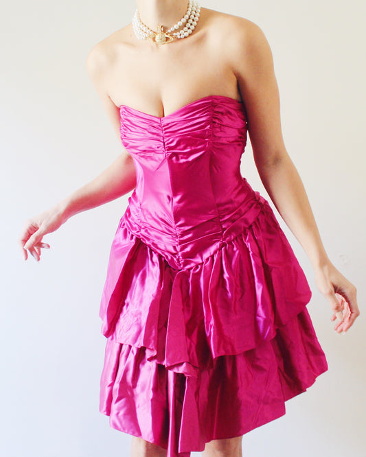 Vintage 1980s Bright Pink Mini Dress – Sleek Formal Cocktail Dress with 80s Statement Style Vintage 1960s Coquette Pink Tiered Tulle Gown
