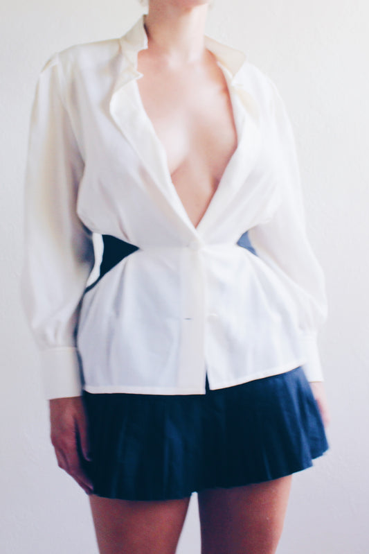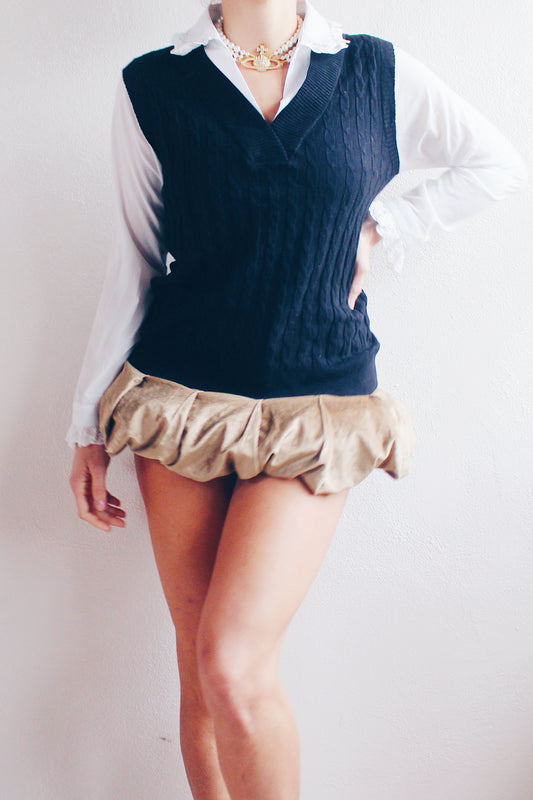 Coquette Academia: Black Knit Layered Vest with Scalloped White Blouse Sleeves and Collar