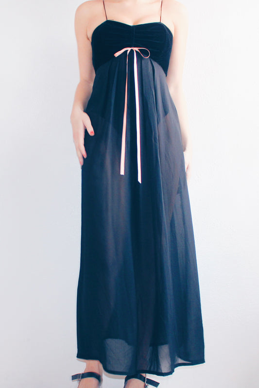 Coquette Formal: Vintage Sheer Formal Dress with Velvet Sweetheart Bust - Ribbon Elegance for Romantic Evenings