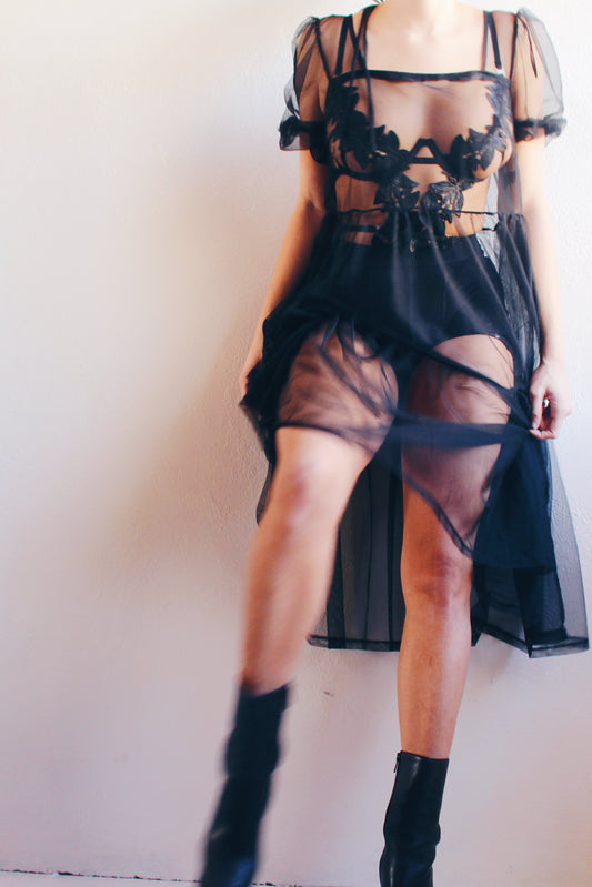 Enchanting Elegance: Sheer Black Babydoll Dress with Puffy Sleeves for Dark Days