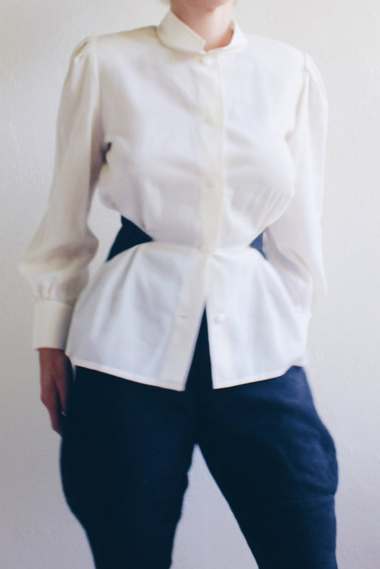 Chic Upcycled White Cropped Blouse with Dramatic Collar: Reversible button up cropped shirt
