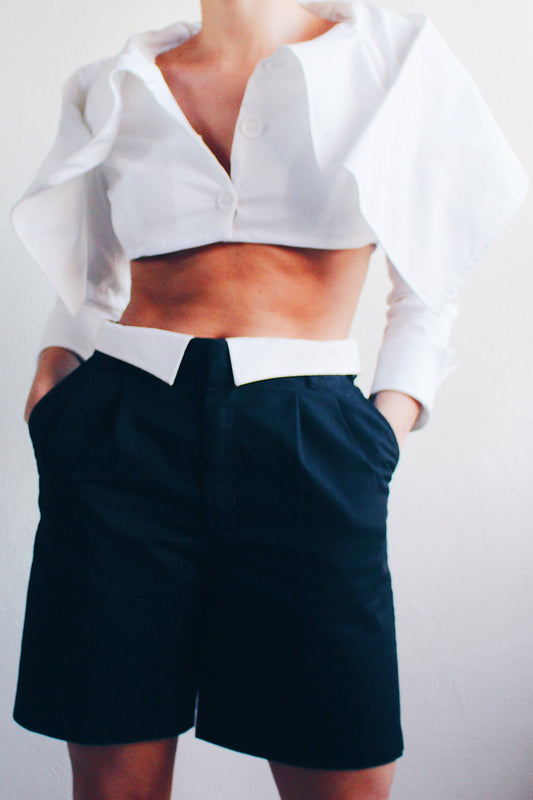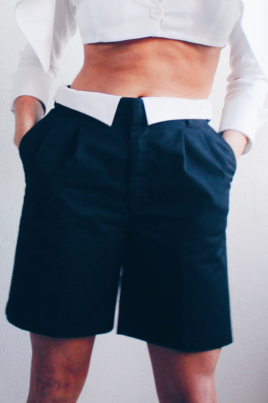 Androgynous Formal: Upcycled Black Pleated Shorts with Attached White Shirt Collar