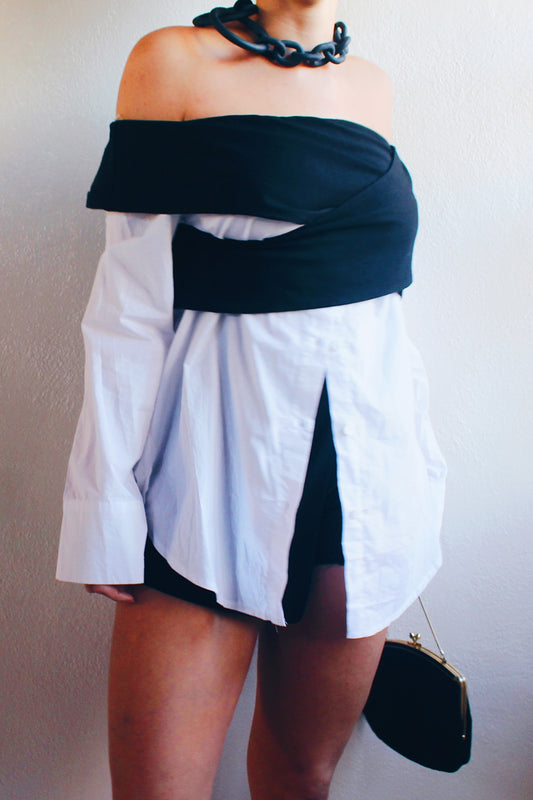 Contemporary Edge: Upcycled White Shirt Dress with Asymmetric Black Bust Wrap
