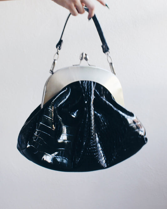 Black Alligator-Textured Giant Leather Coin Purse Handbag with Silver Clasp – Bold Statement Piece