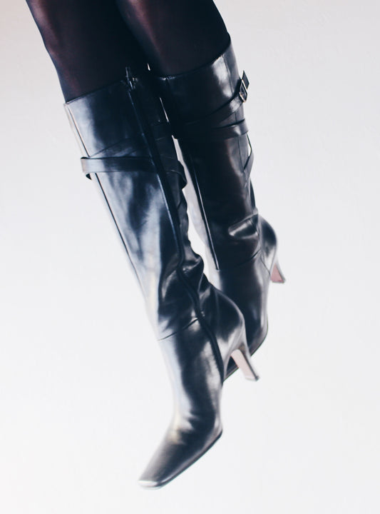 Vintage 90s Franco Sarto Black Leather Tall calf Boots – Kitten Heel boots | Chic Minimalist Style