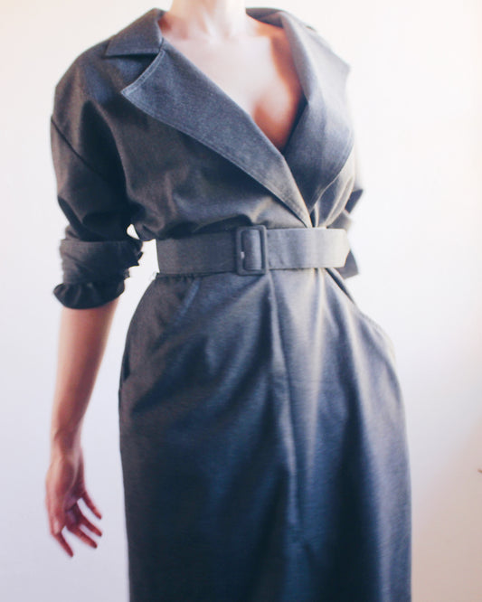 Vintage 90s Wool Trench‑Style Midi Dress – Dark Grey/Khaki, Large Collar & Belted Waist, Noir Professional Chic