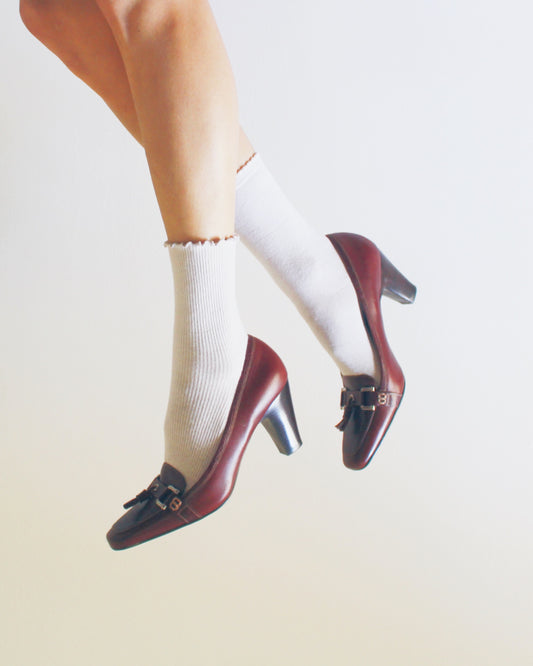 Vintage Y2K Librarian Aesthetic: Chestnut Brown Leather Heeled Vintage Loafers with Tassel - Librariancore Academic the