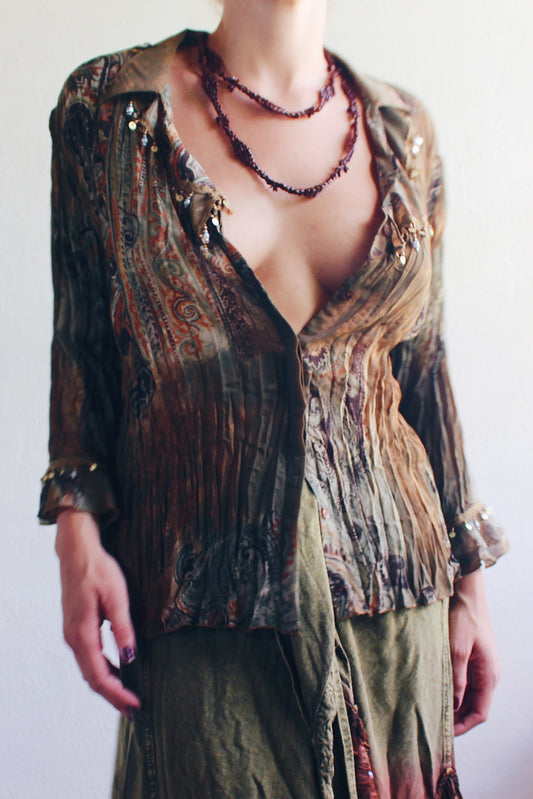 Whimsygoth Green Brown Blouse / Vintage 90s Textured Beaded top / Ruffle sleeve Paisley Artsy Witch Shirt