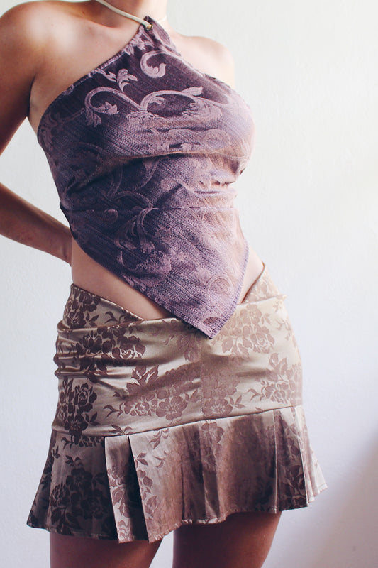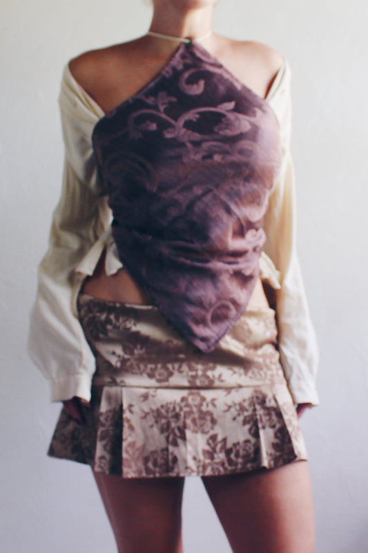Brown Baroque Print Reworked French hanky hem shirt / Upcycled Bandeau Tapestry Haltar Crop Top