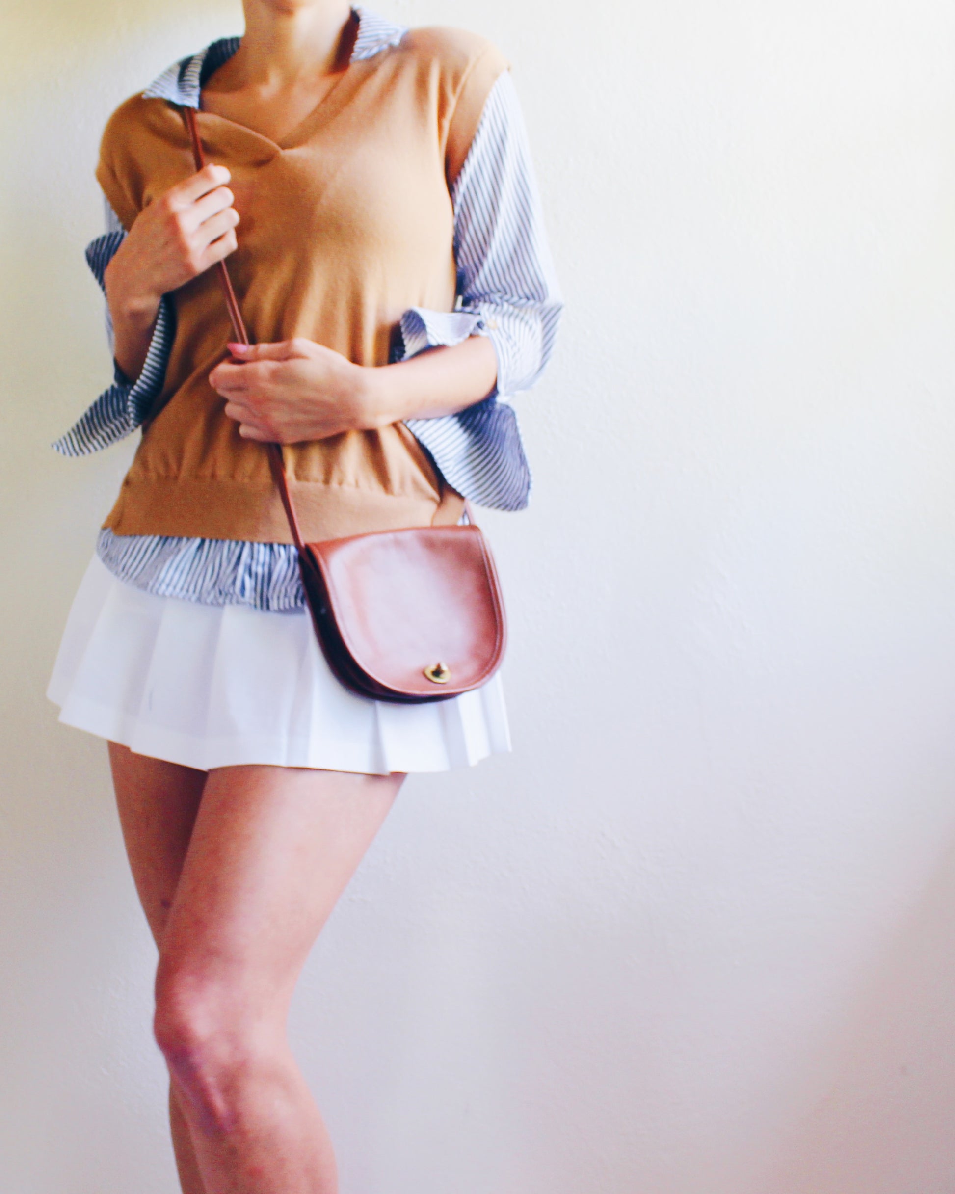 Tan Knit Layered Vest Top with Blue‑White Striped Shirt Sleeves & Collar – Academic Layering Blouse Style
