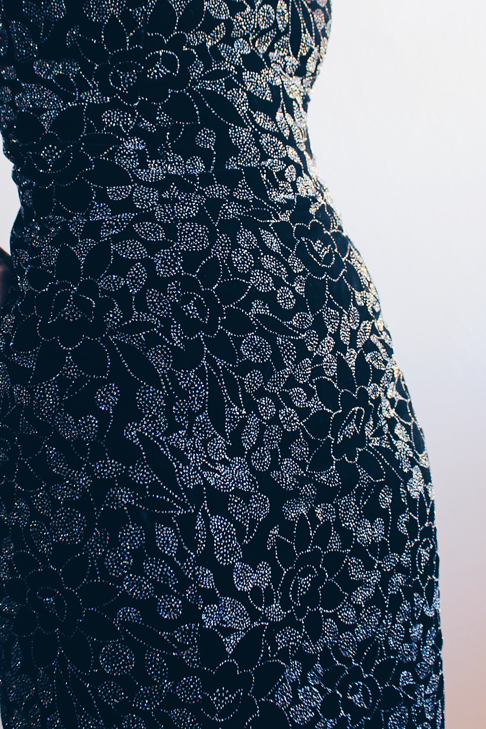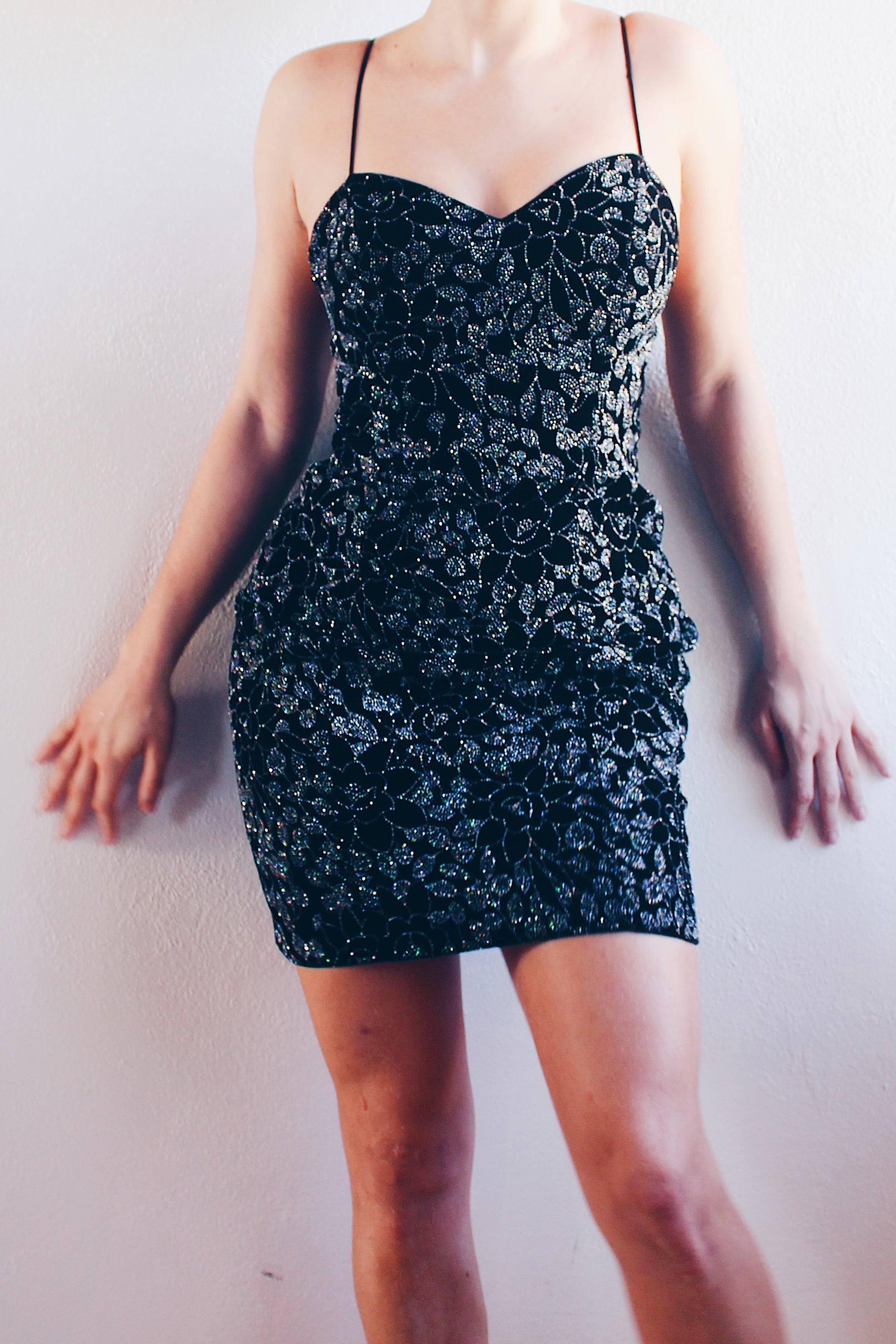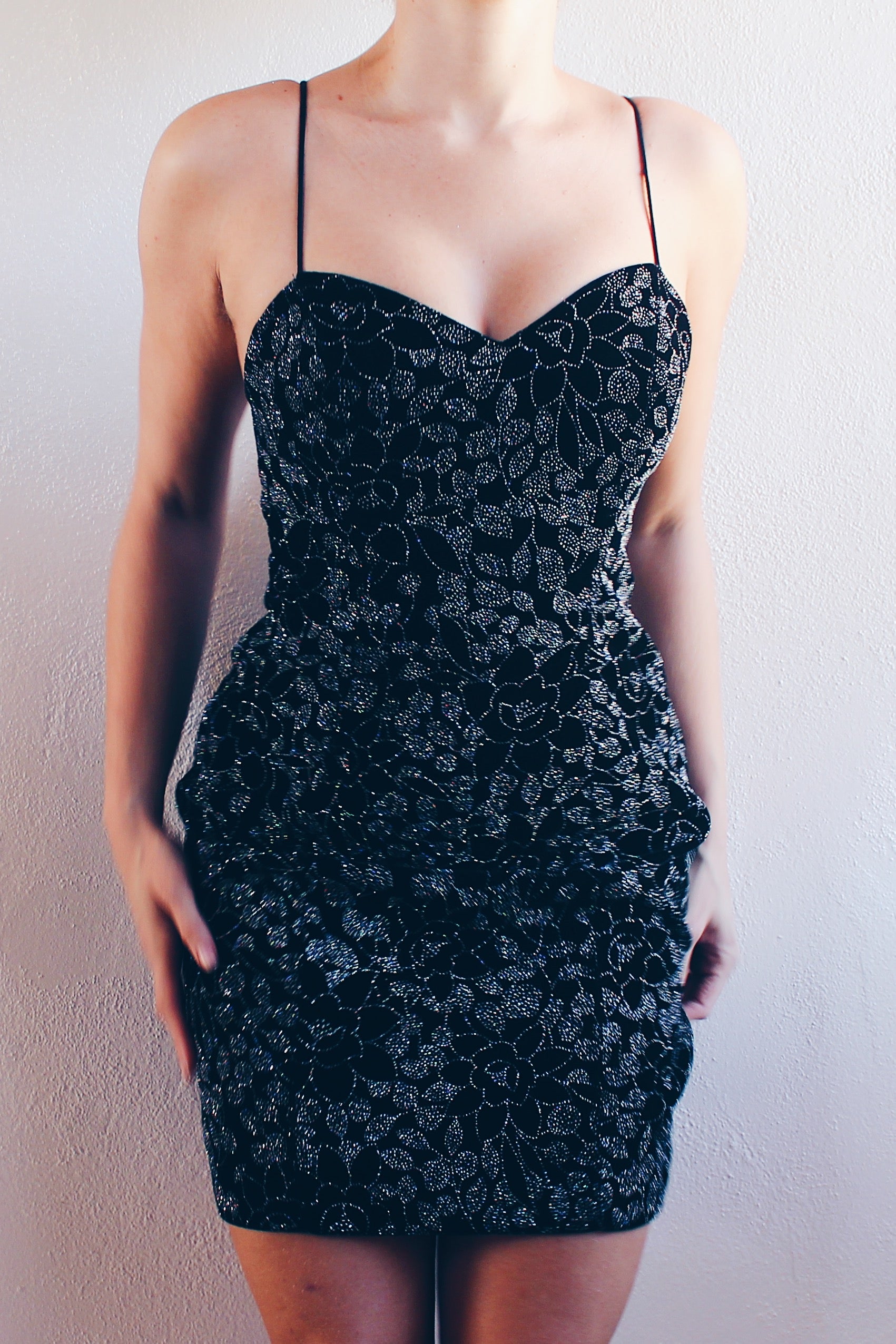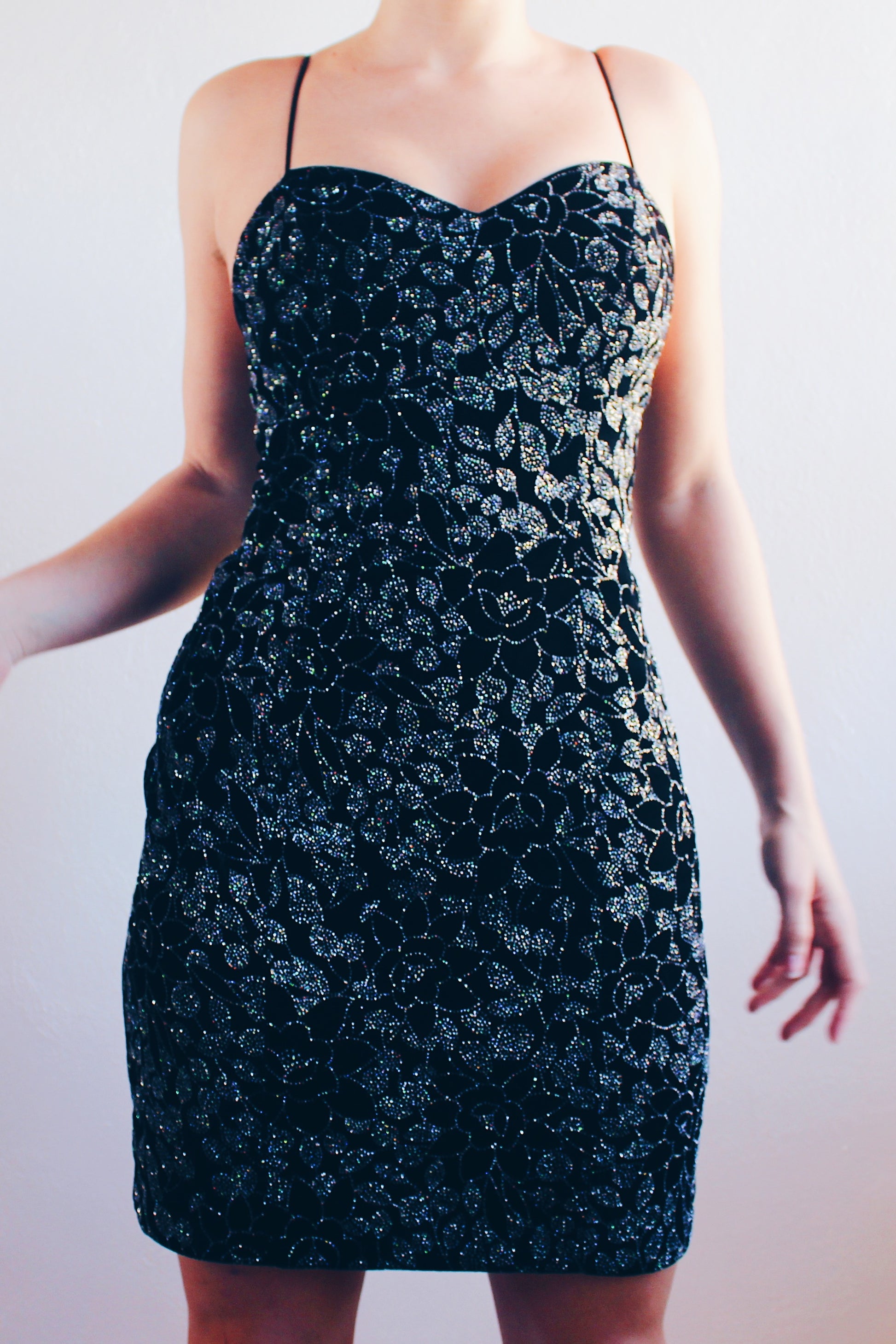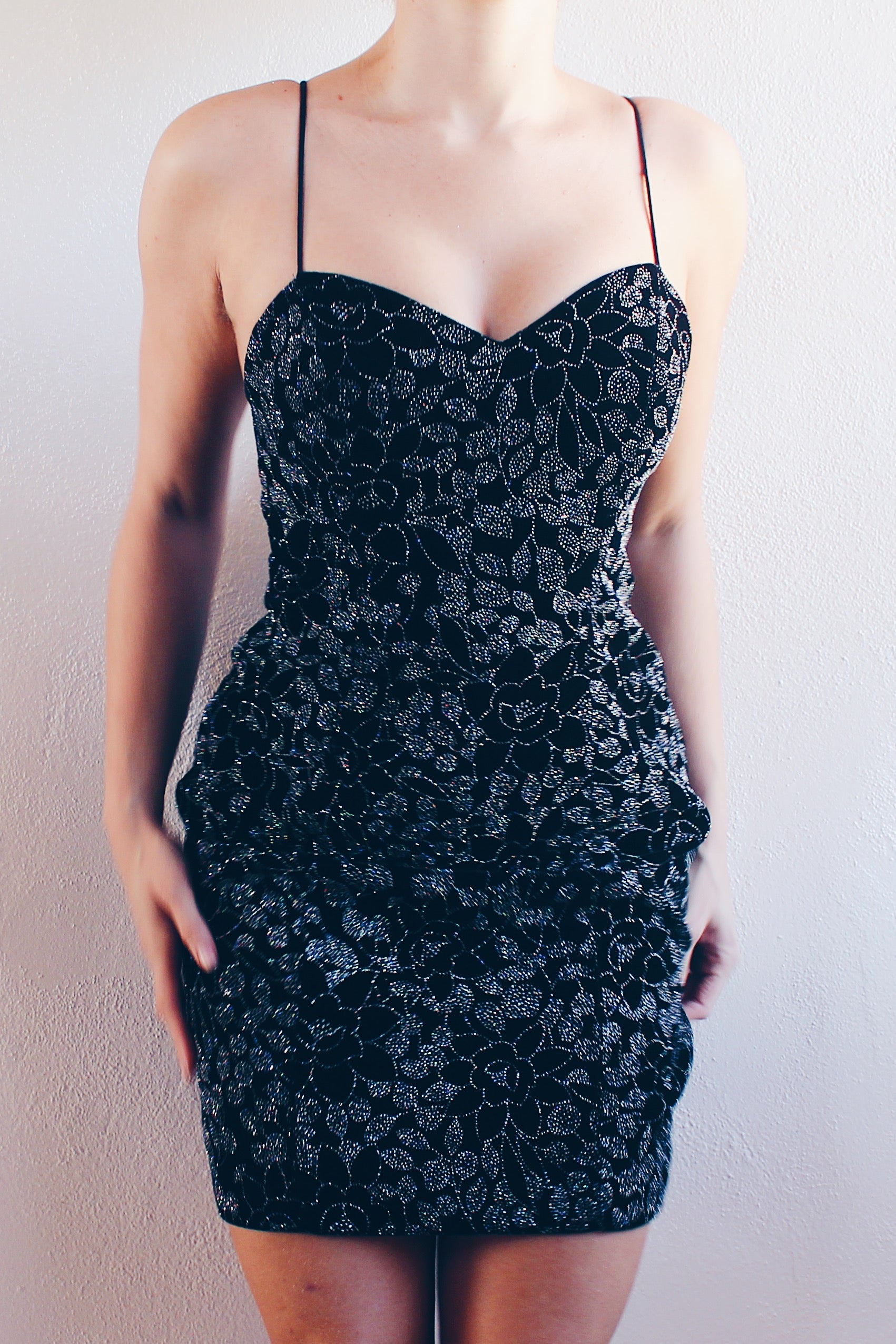 NYE Glamour: Black Velvet Glittery Mini Dress with Shimmery Flowers