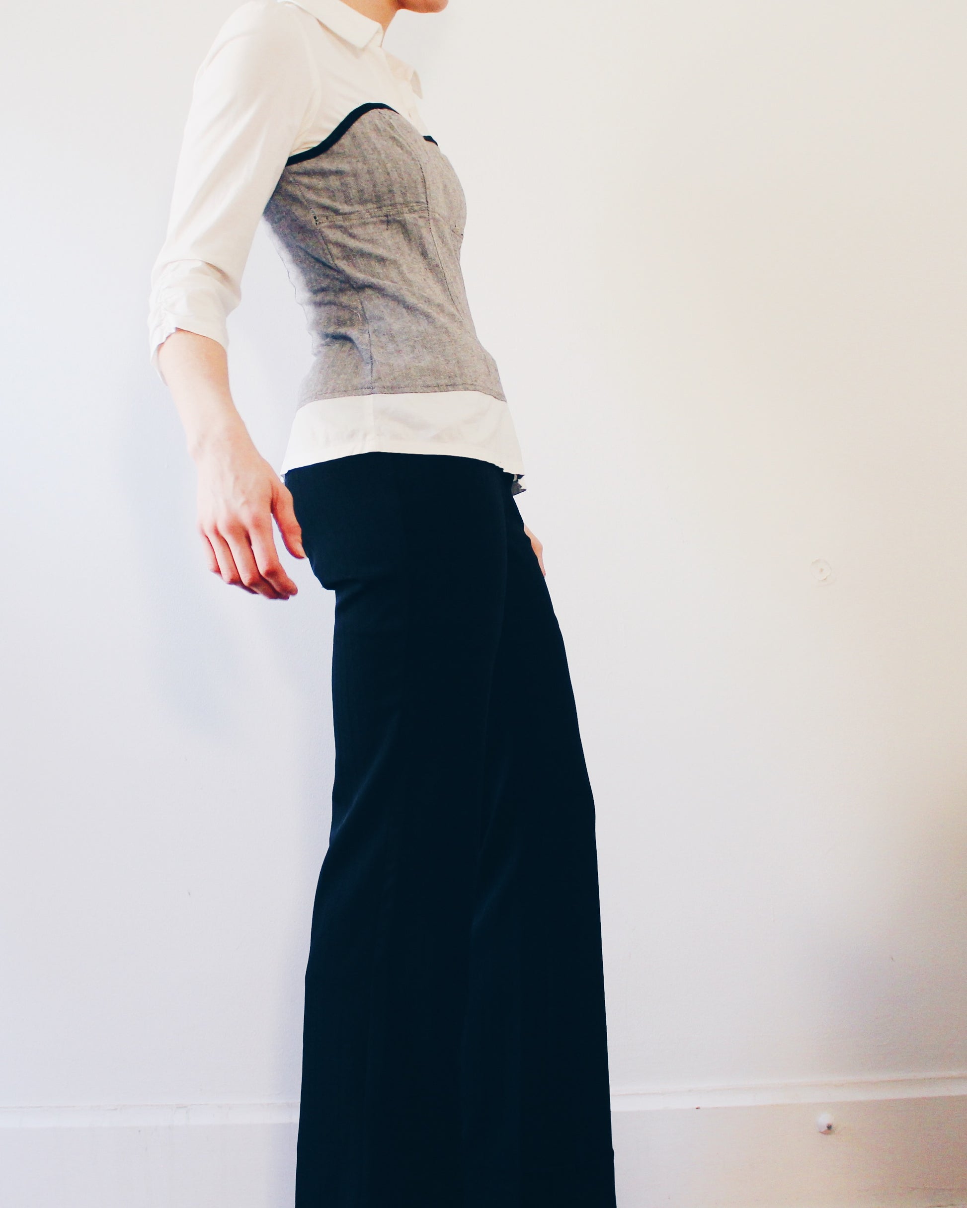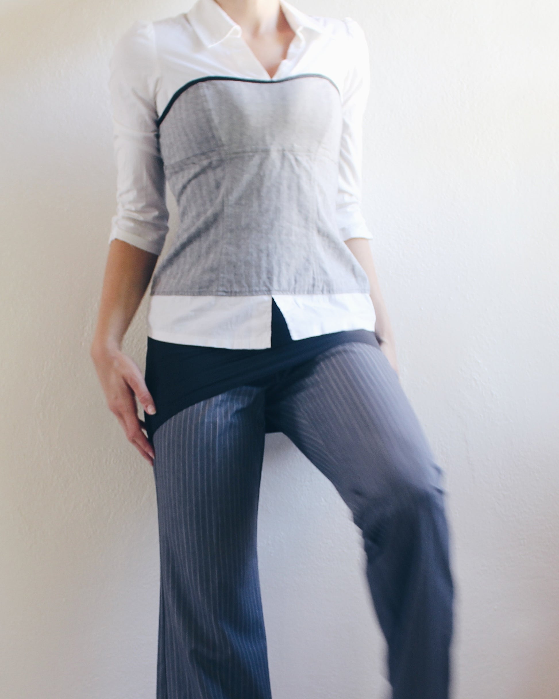 Y2K Office Siren Layered Illusion Blouse | 2000s White Collared Shirt with Grey Tube Overlay | Fitted Stretch Cotton Corporate Chic Top