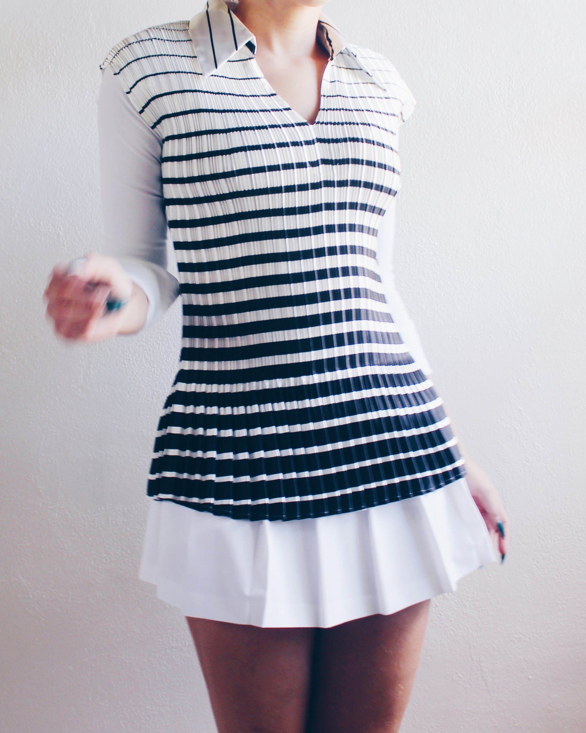 Striped Black and White Pleated Shirt with Collar – Micro Pleats Inspired by Issey Miyake | Chic Office Wear
