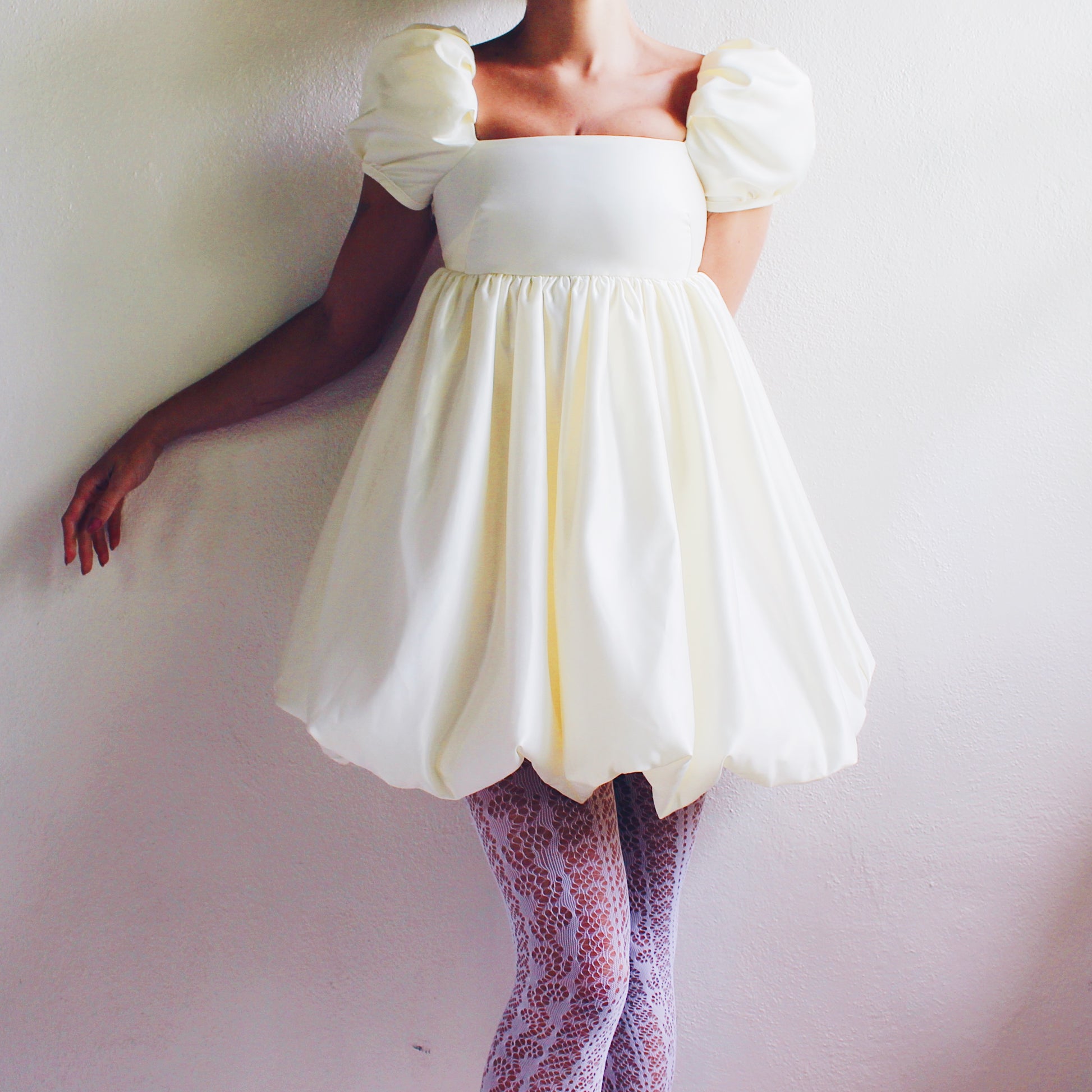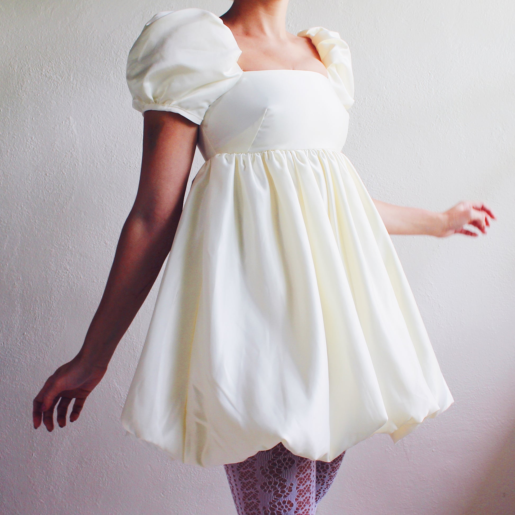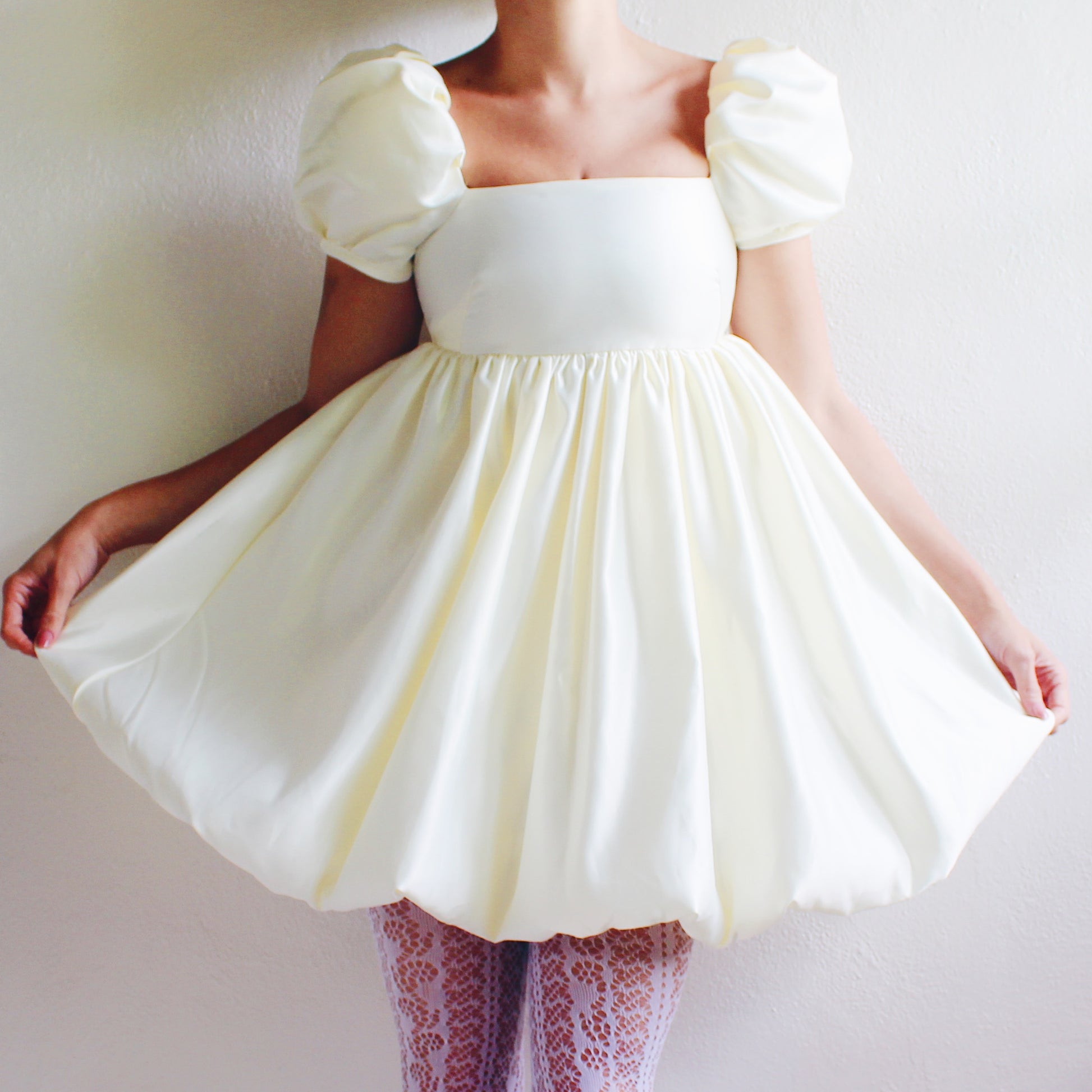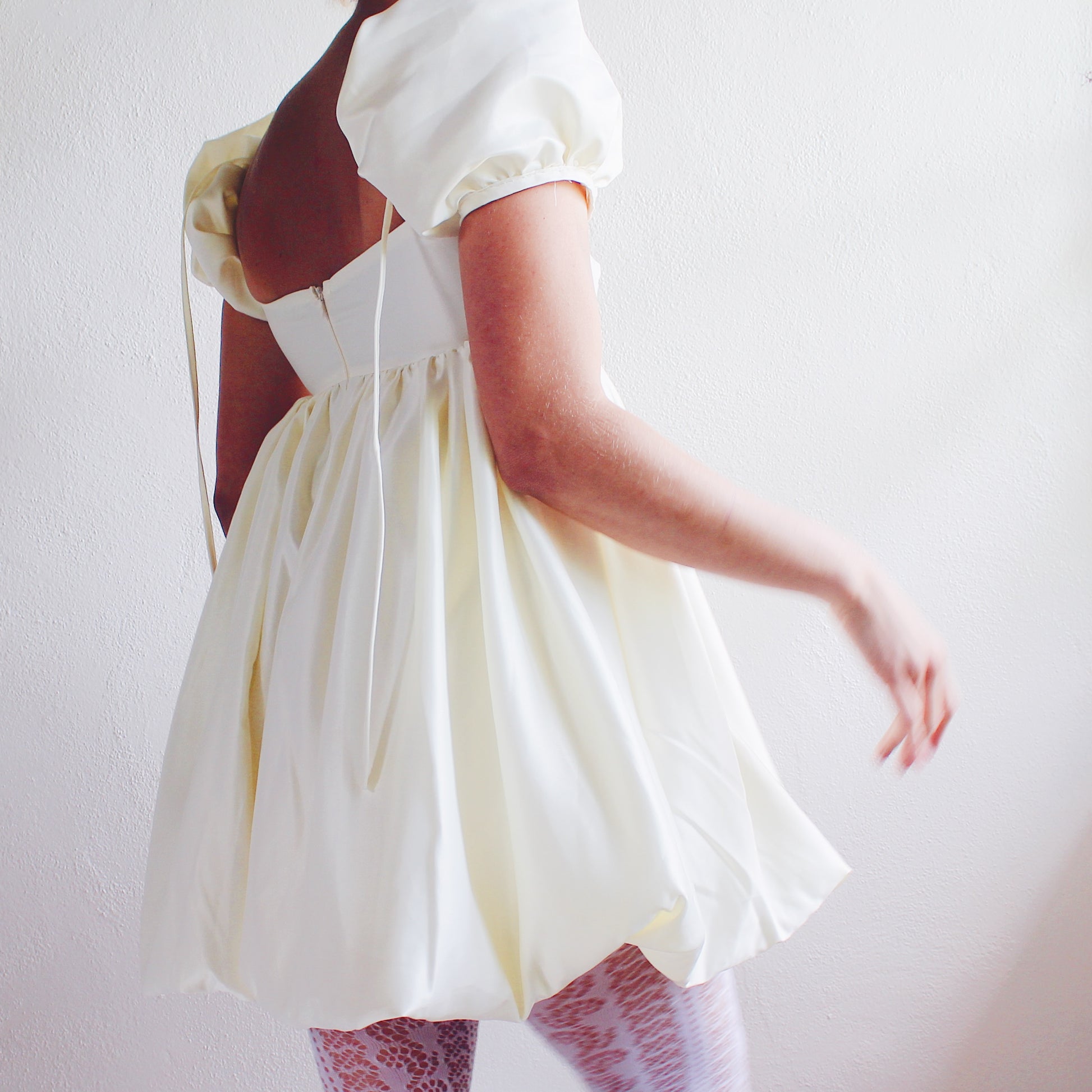 Elevate your closet with our Upcycled Cream Babydoll Dress, a whimsical blend of kawaii cuteness, coquette charm, and ballerina-inspired style. Crafted with attention to detail, this adorable dress features bubble sleeves and an A-line flair bubble hem, adding playful flair to any occasion.