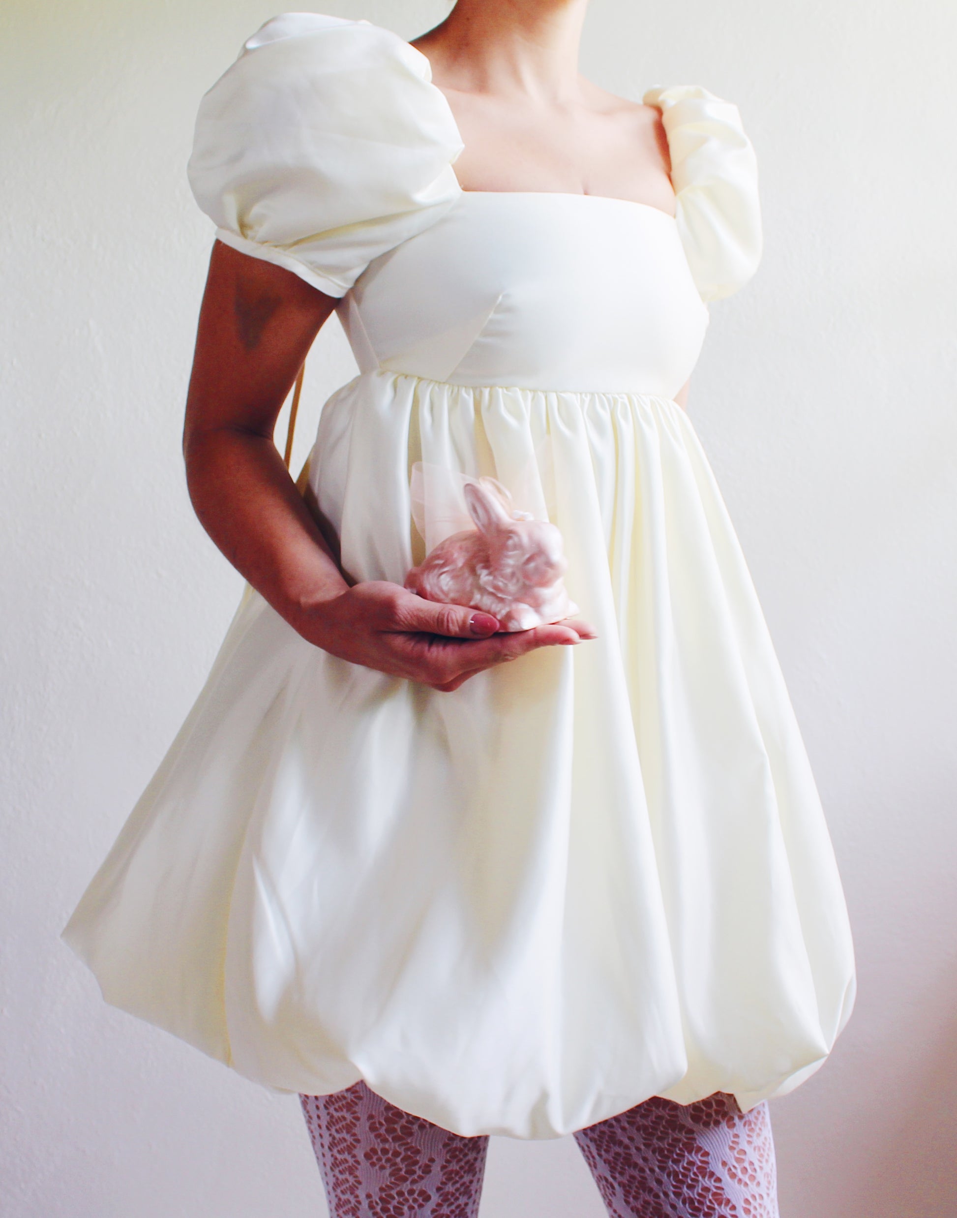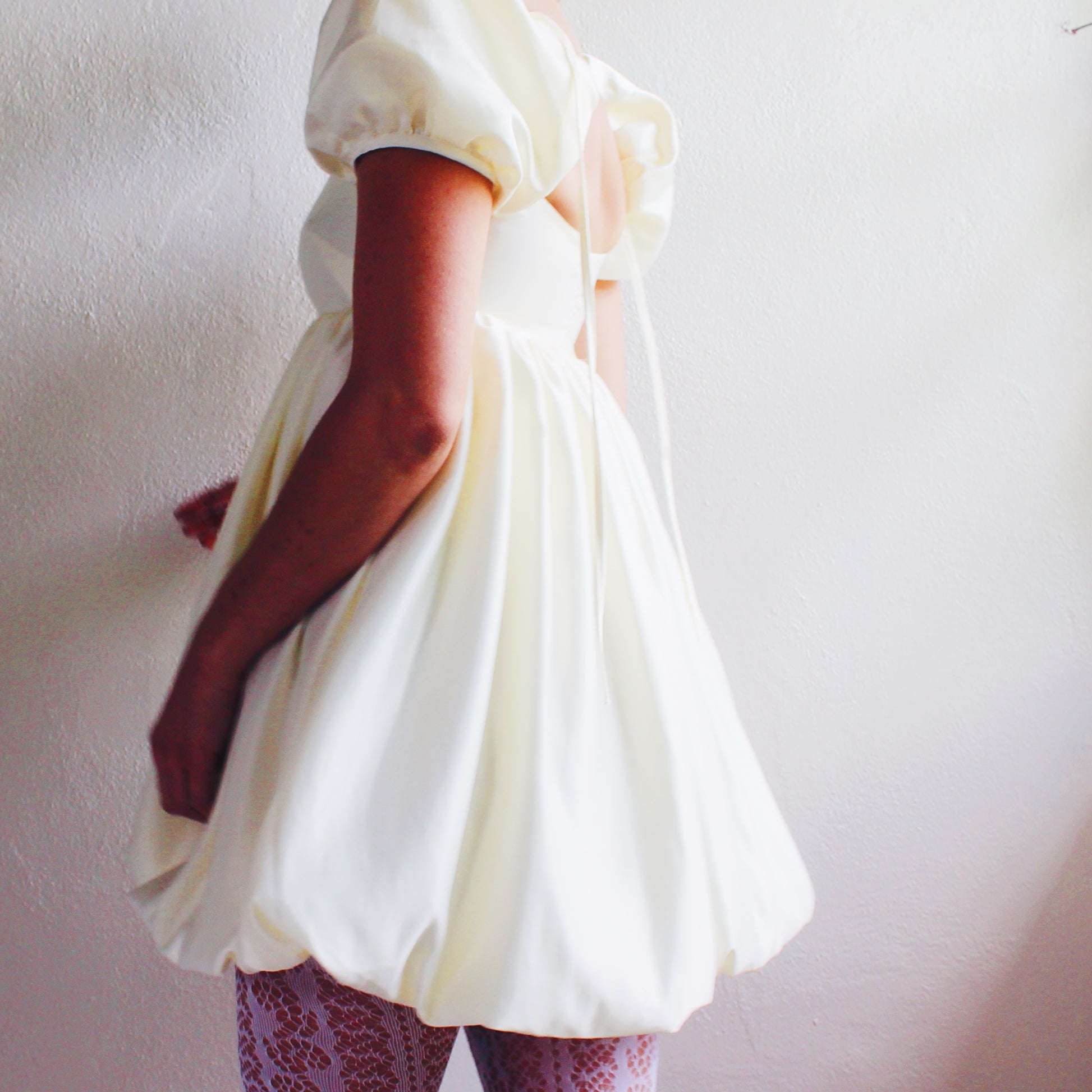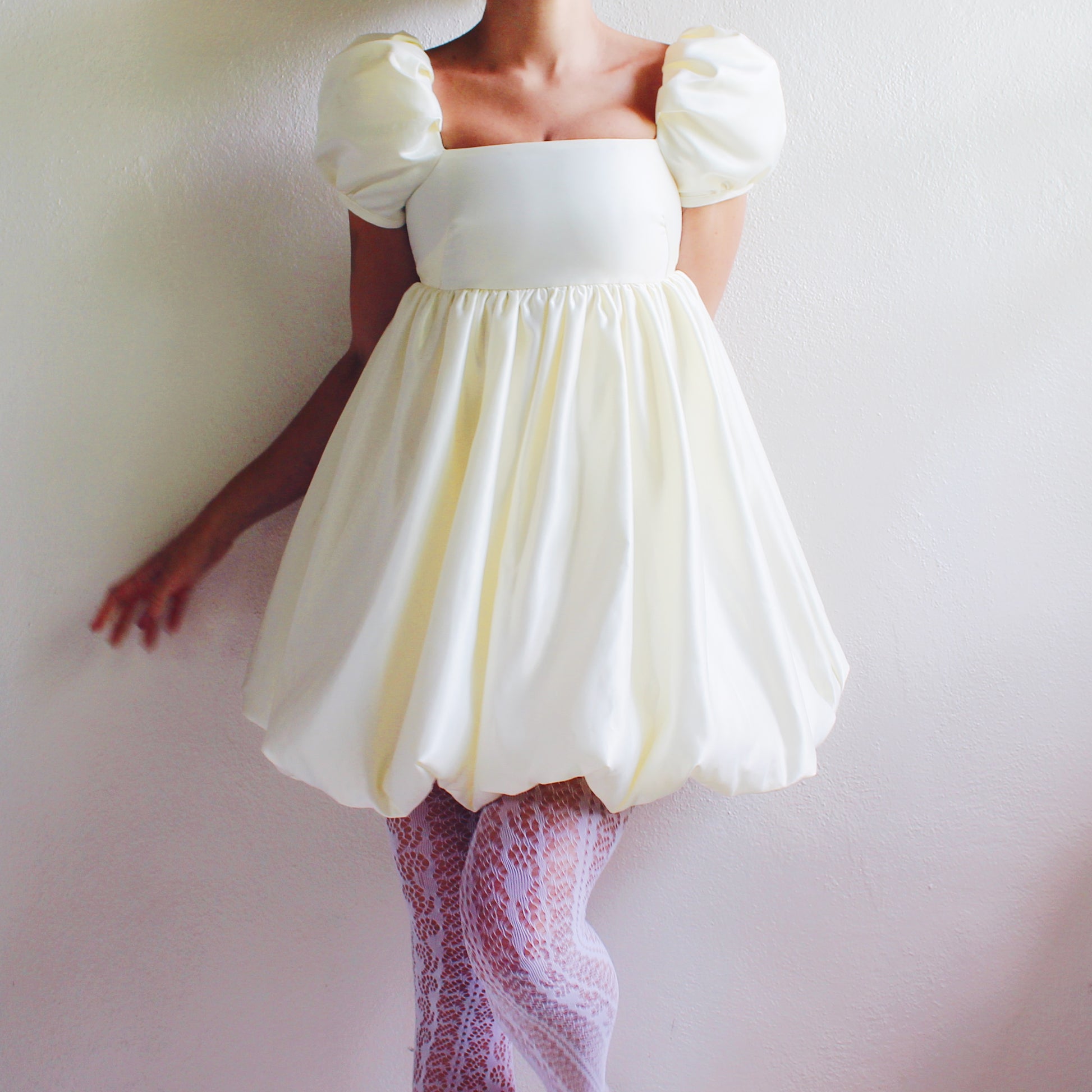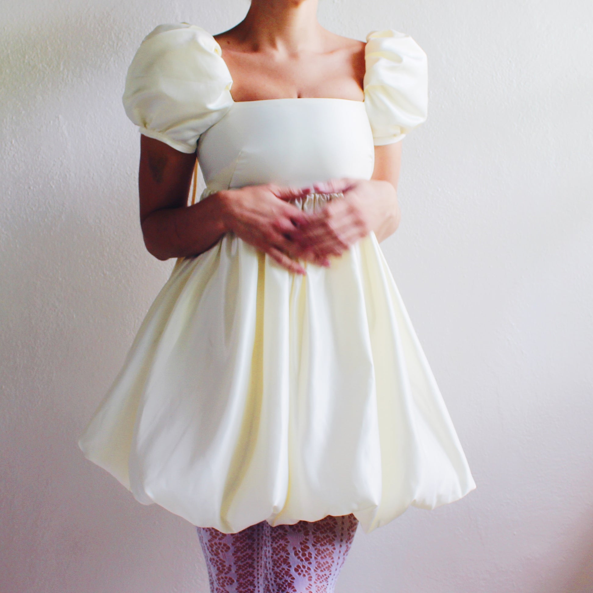Elevate your closet with our Upcycled Cream Babydoll Dress, a whimsical blend of kawaii cuteness, coquette charm, and ballerina-inspired style. Crafted with attention to detail, this adorable dress features bubble sleeves and an A-line flair bubble hem, adding playful flair to any occasion.