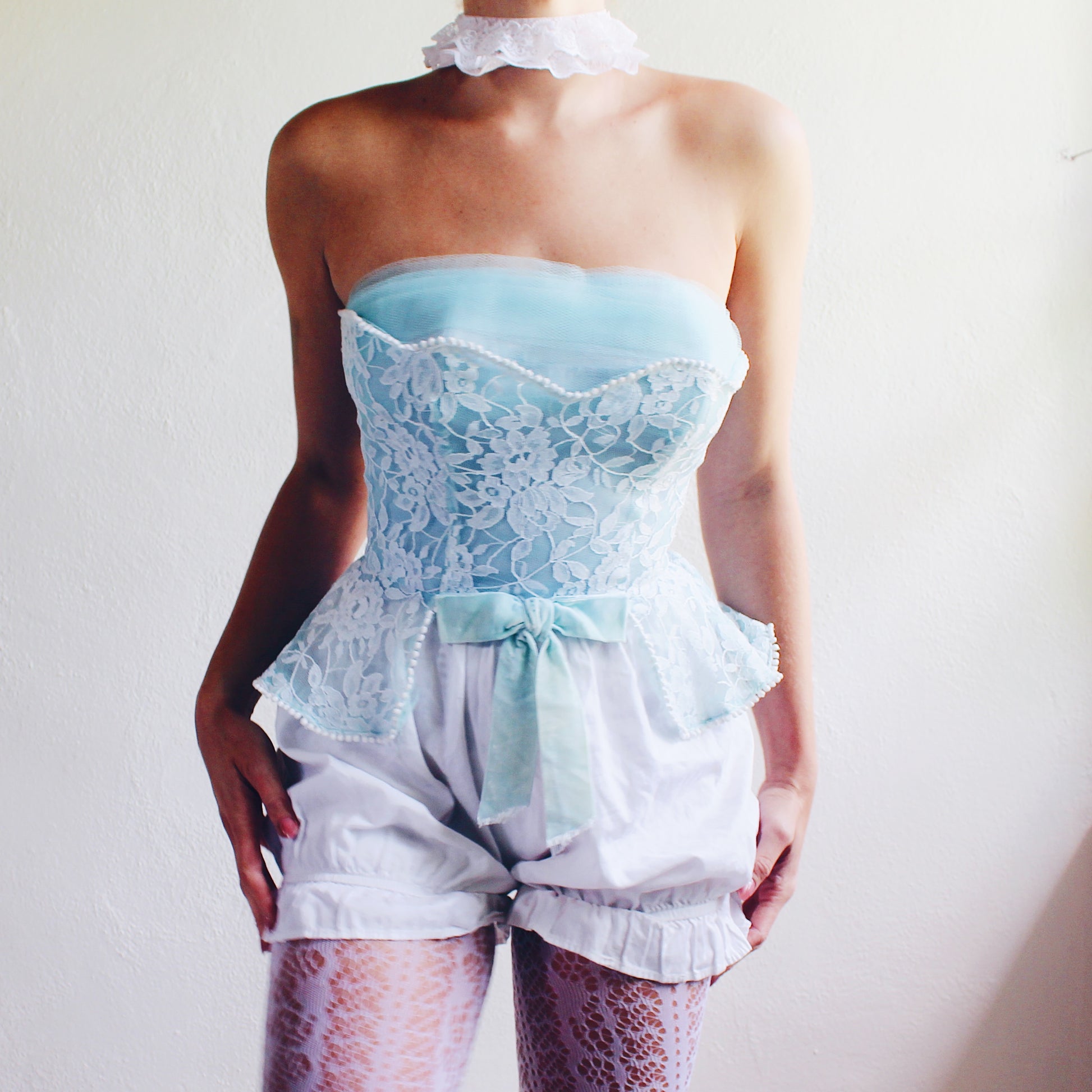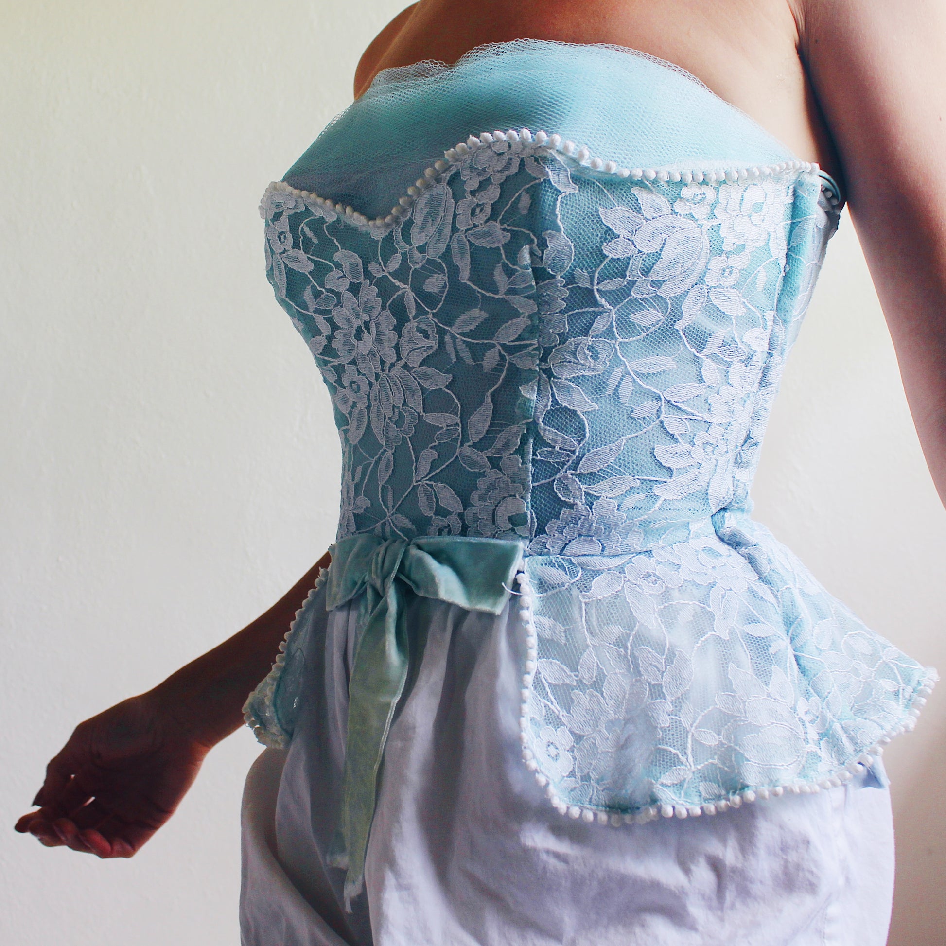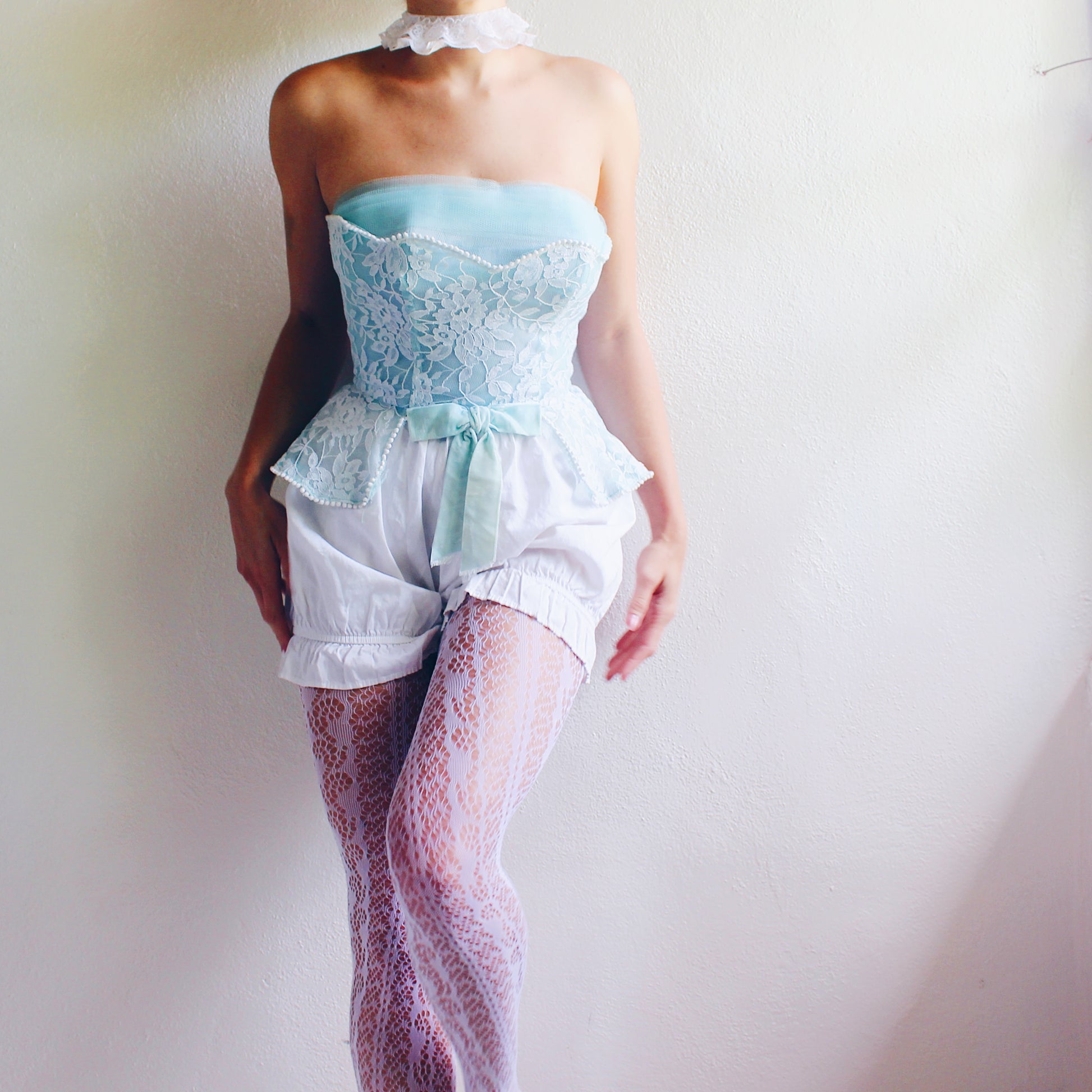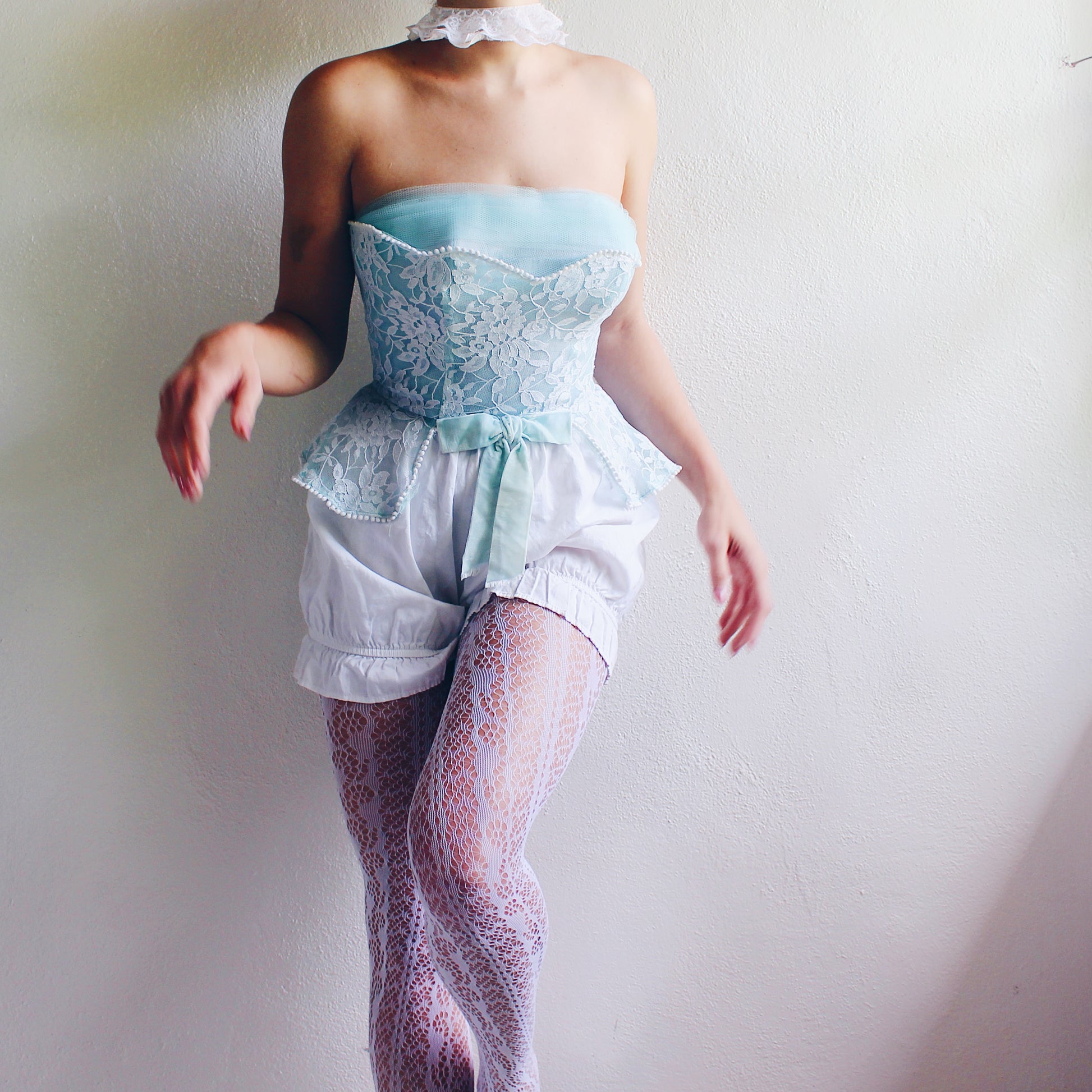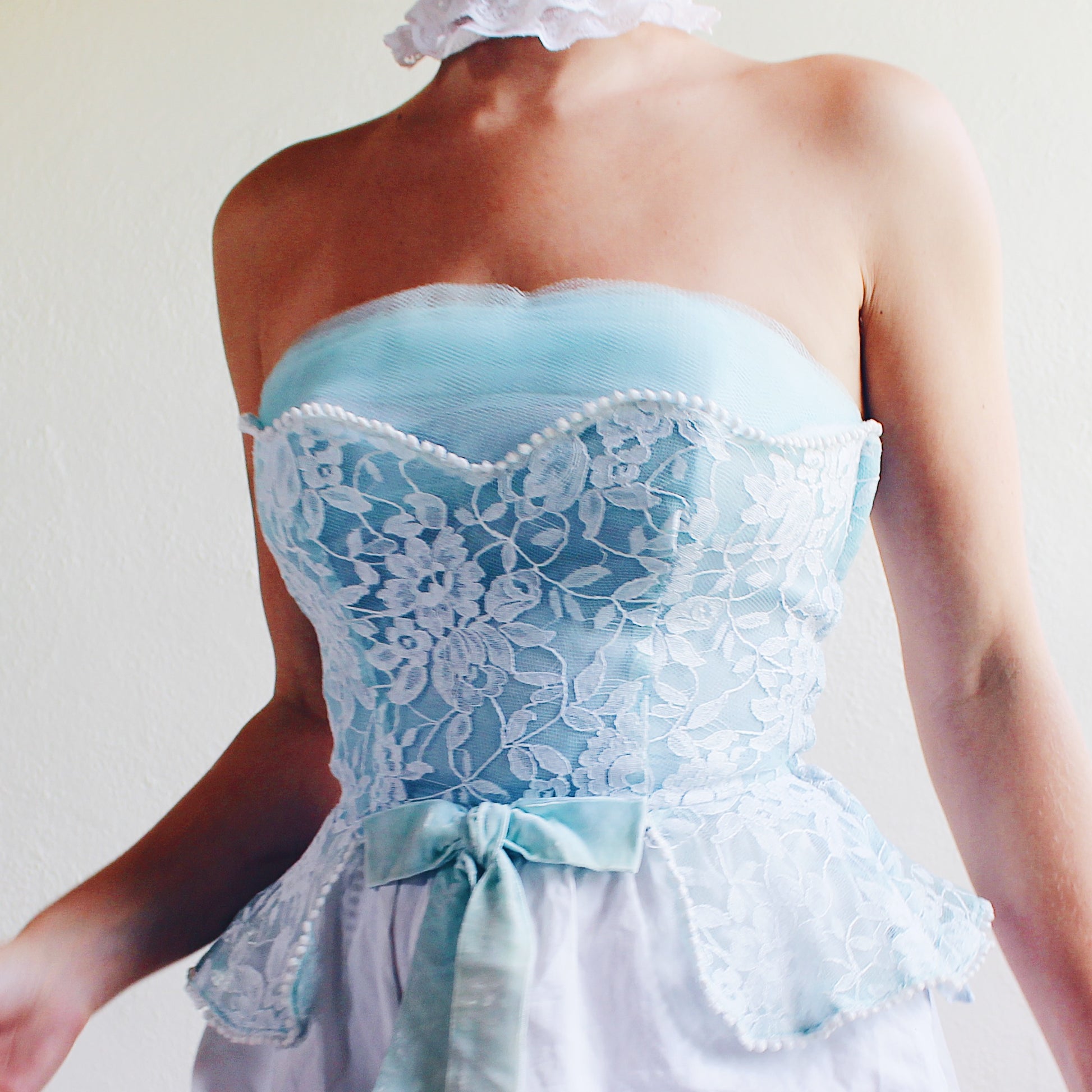 Upgrade your style game with this upcycled lace sensation that stands out on any occasion; a true gem from the 1960s transformed into a contemporary coquette masterpiece. Embrace the allure of retro fashion with its light blue hue and intricate mesh bust detailing. Our upcycled creation blends timeless charm with modern flair, perfect for those who appreciate a touch of princess style in their wardrobe.
