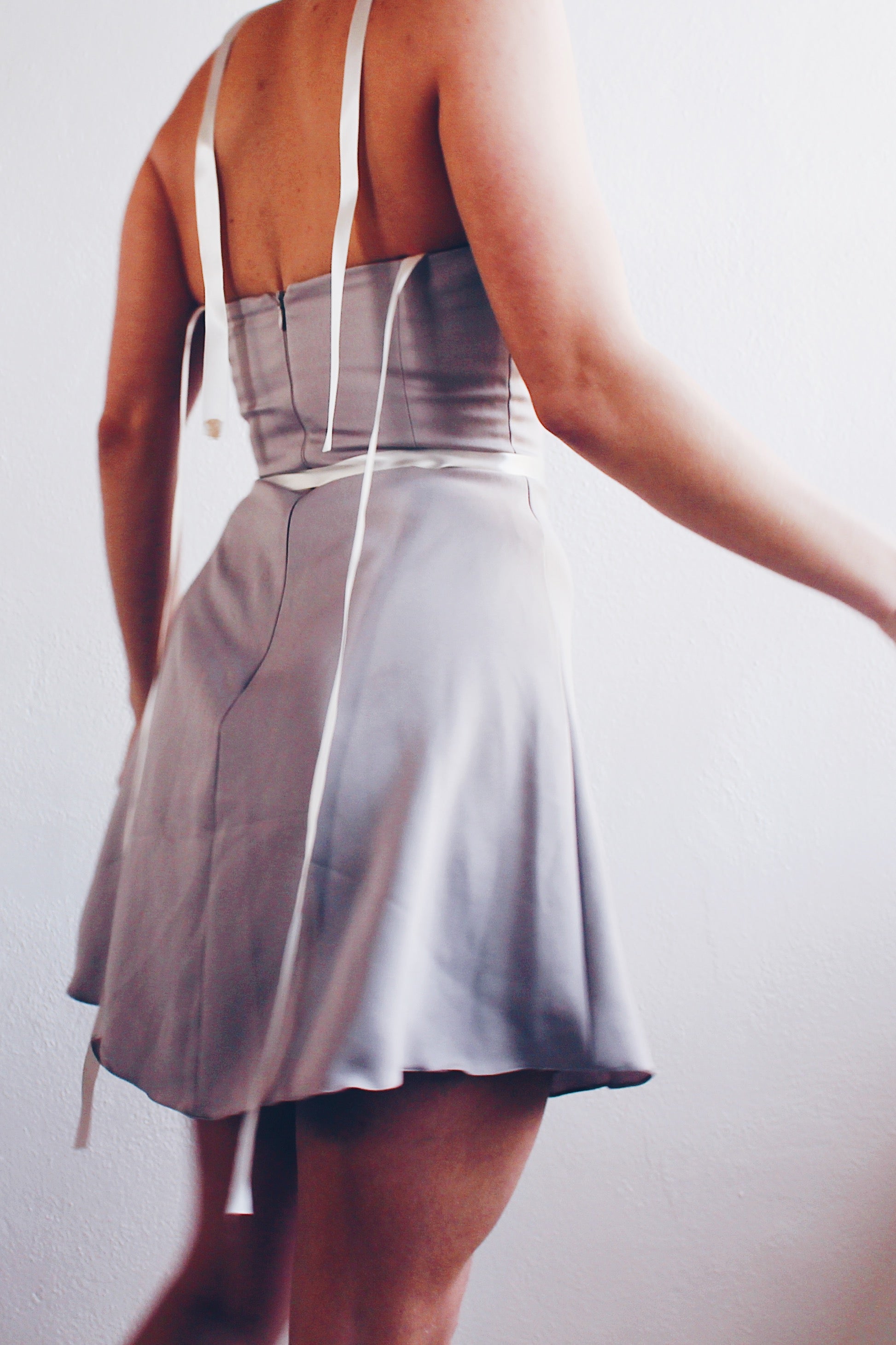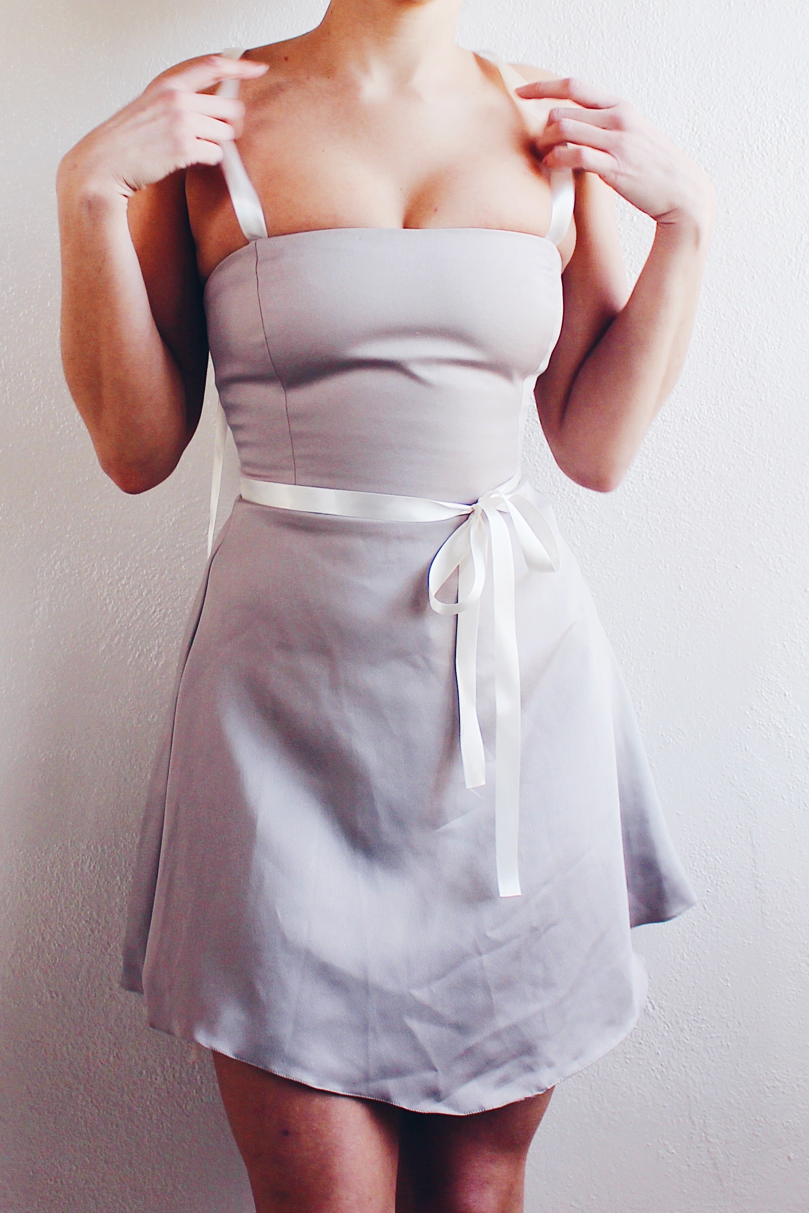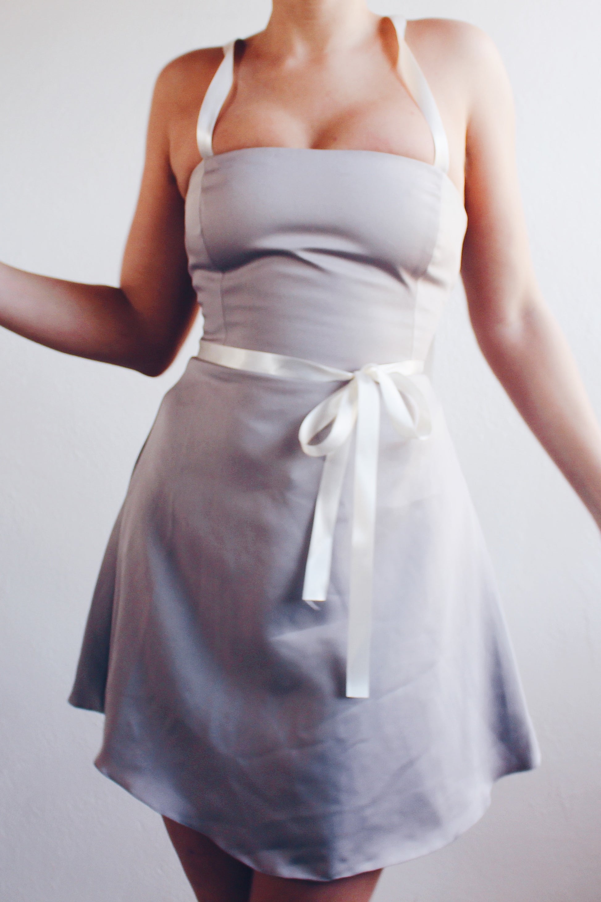 Less is more, especially when it comes to style. This dress proves that you don't need excessive frills to make a statement; a well-tailored silhouette and sleek design do the trick. Make a statement with this minimalist yet chic dress, carefully designed to accentuate your figure. The khaki-grey hue adds a timeless touch, while the upcycled ribbon details bring a personalized vintage charm.