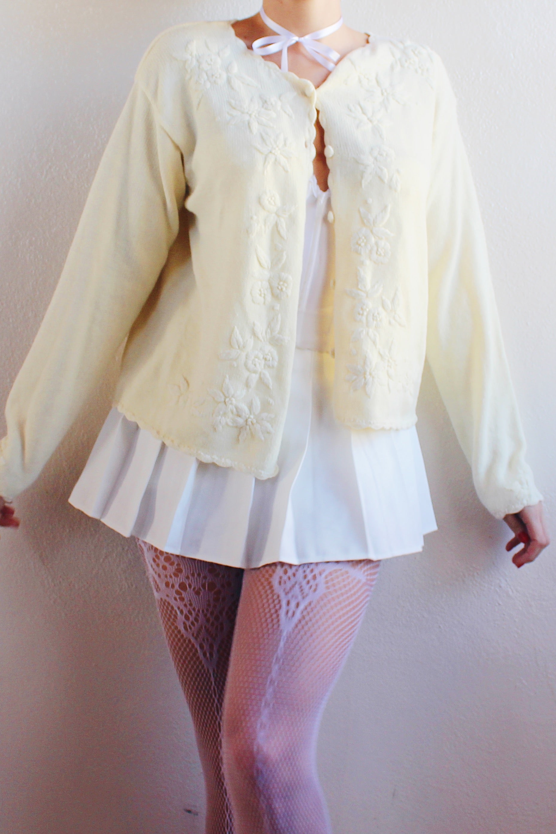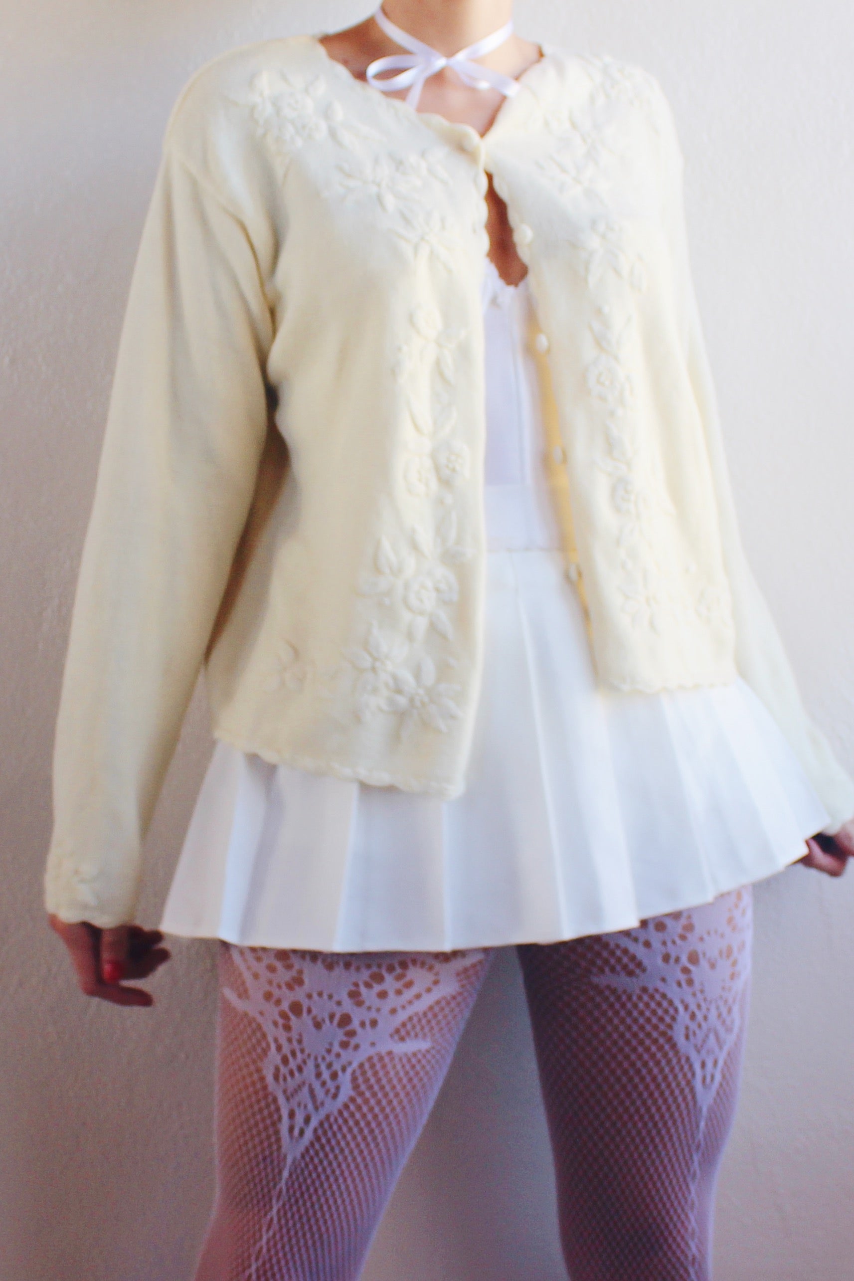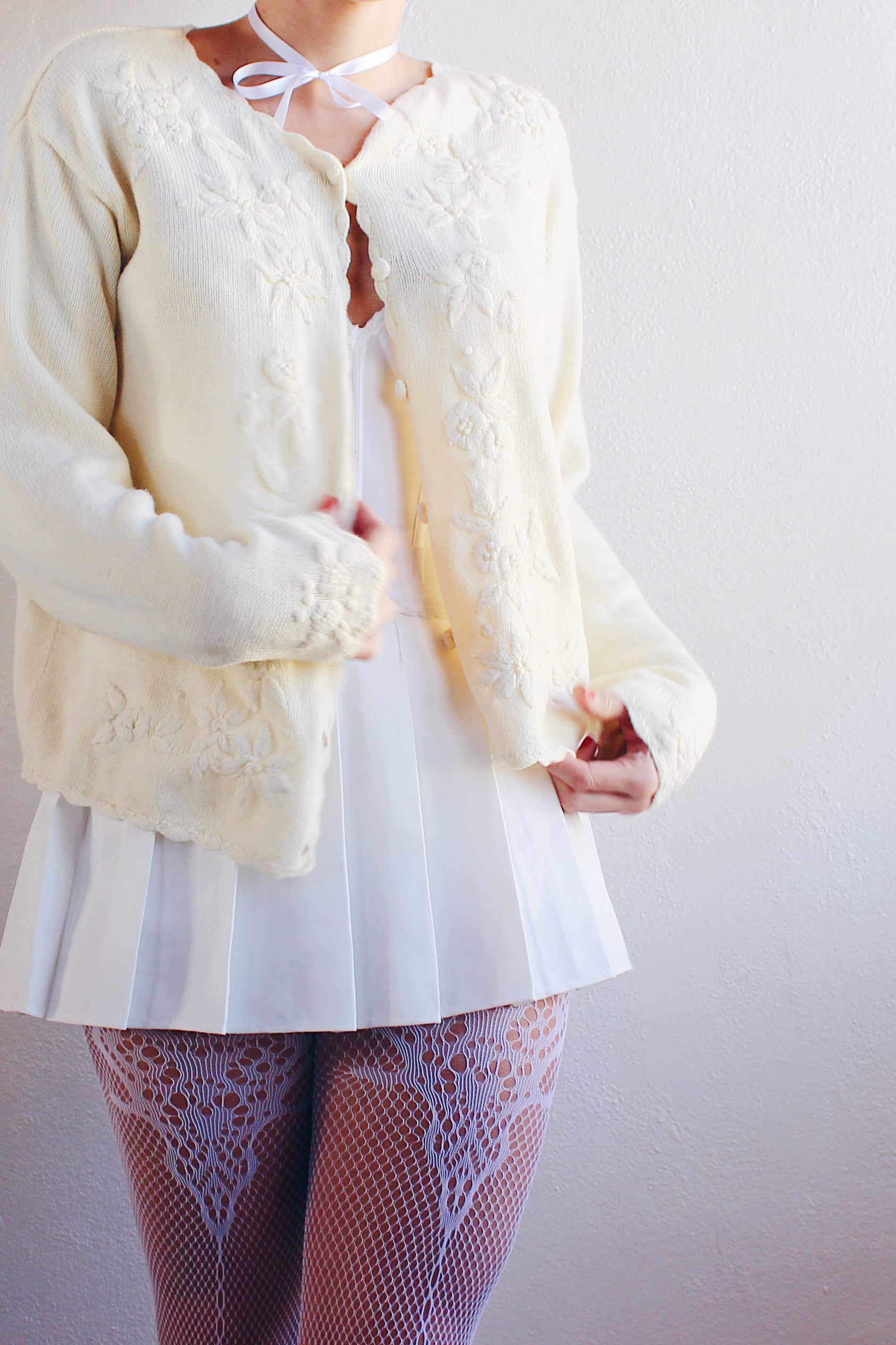 Vintage Cream Knit Floral Coquette Cardigan | 1980s Retro Flower Sweater | Cozy Kawaii Chic