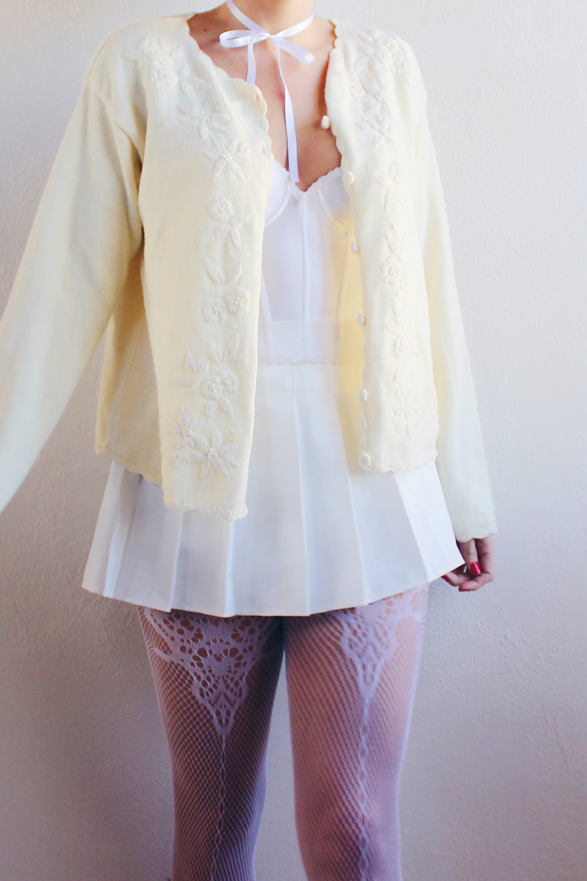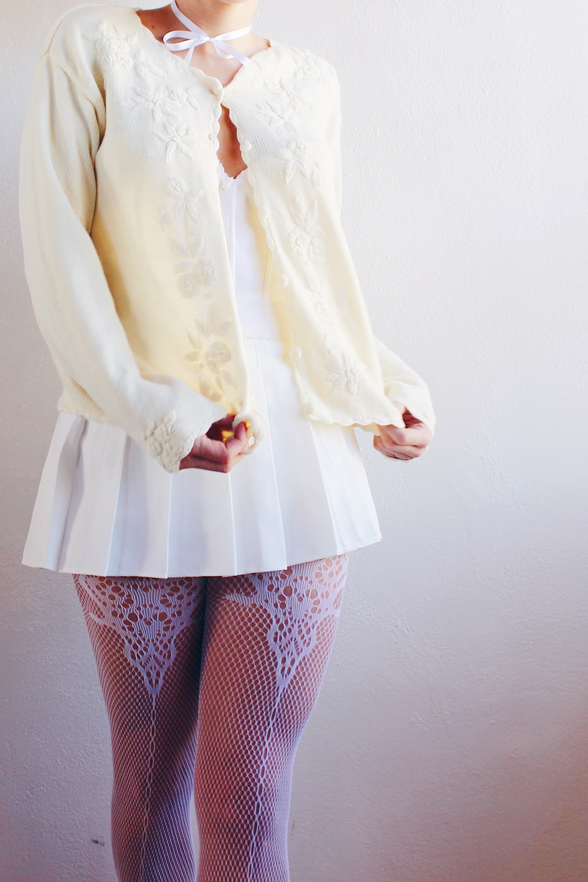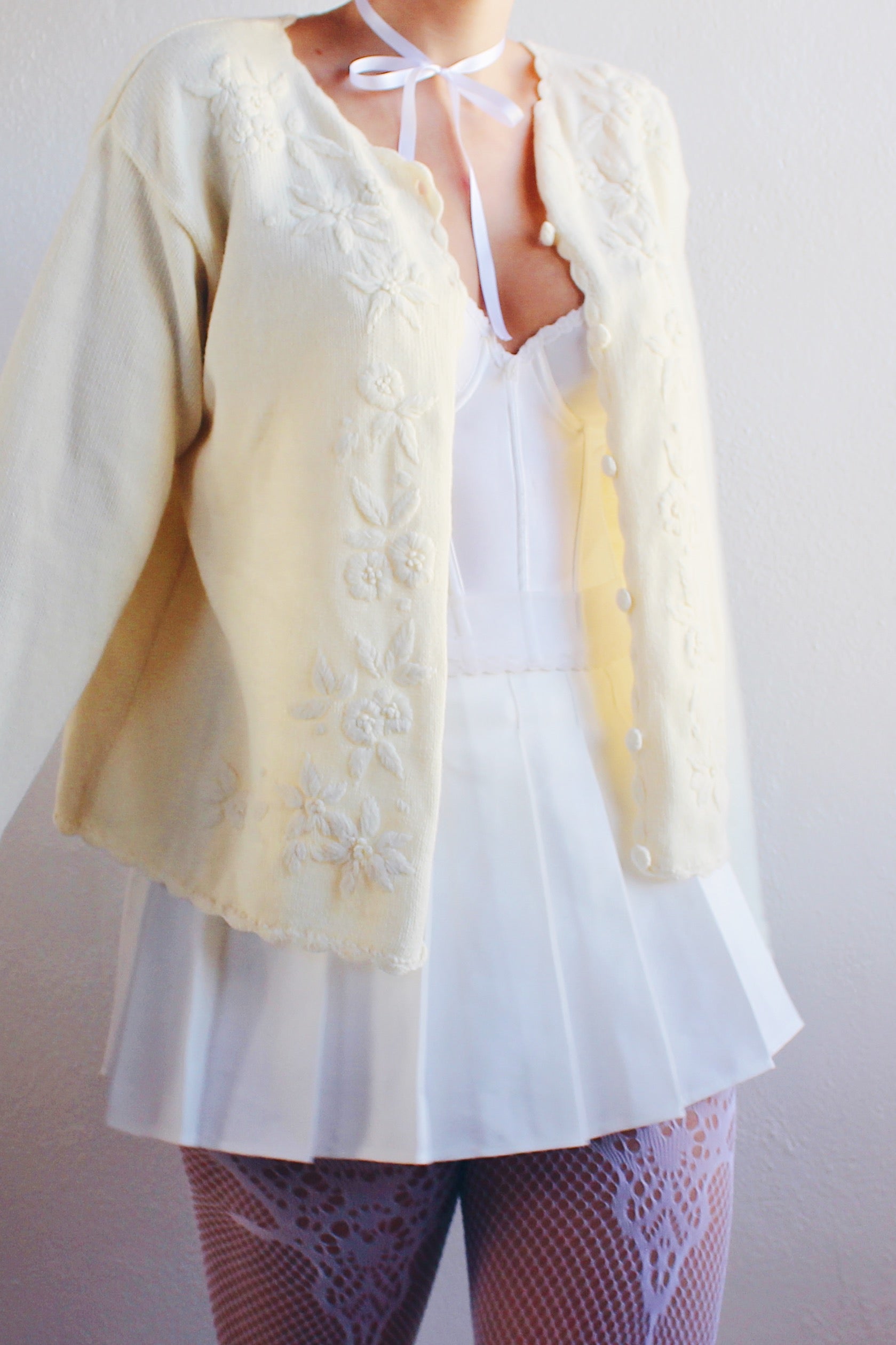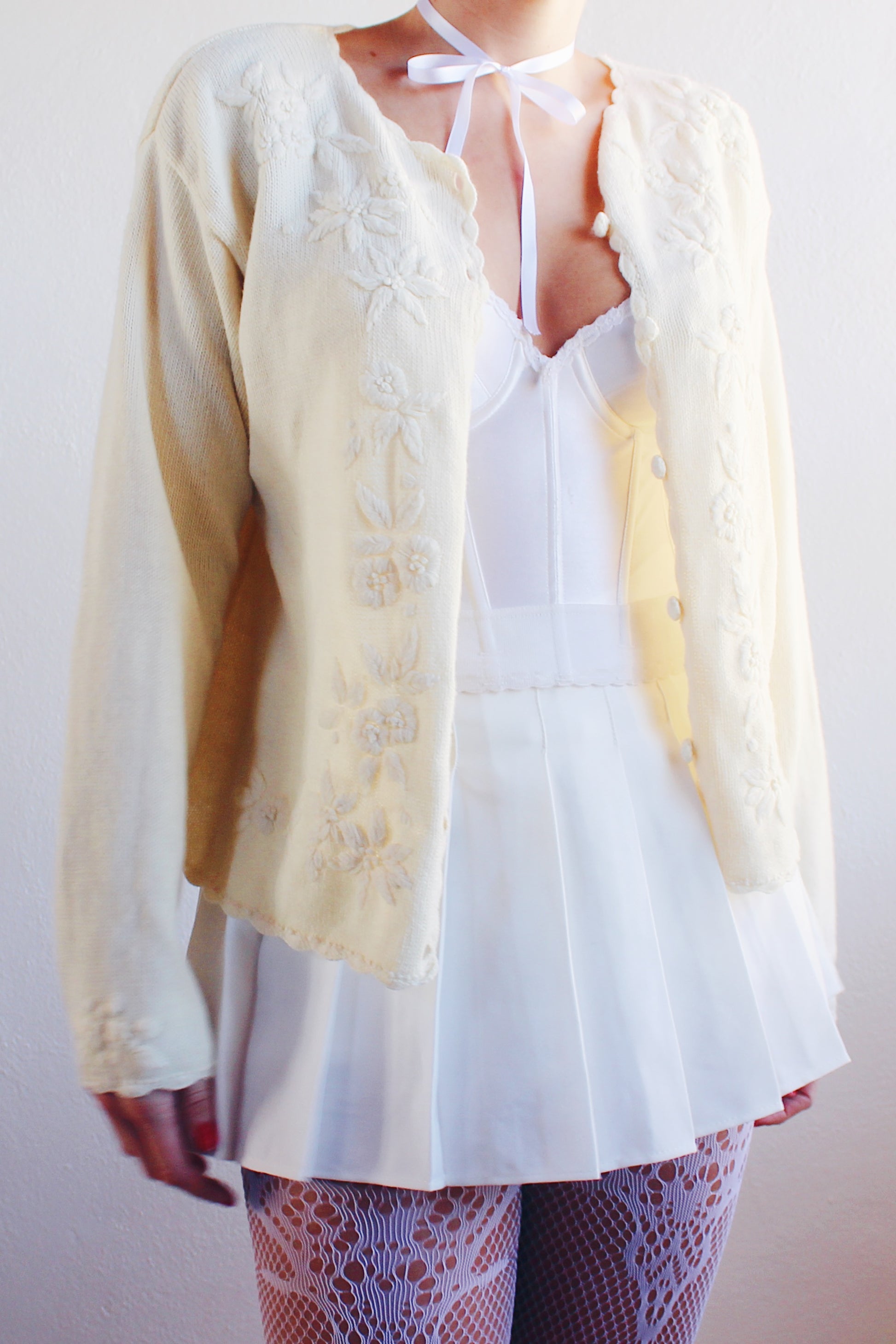 Vintage Cream Knit Floral Coquette Cardigan | 1980s Retro Flower Sweater | Cozy Kawaii Chic