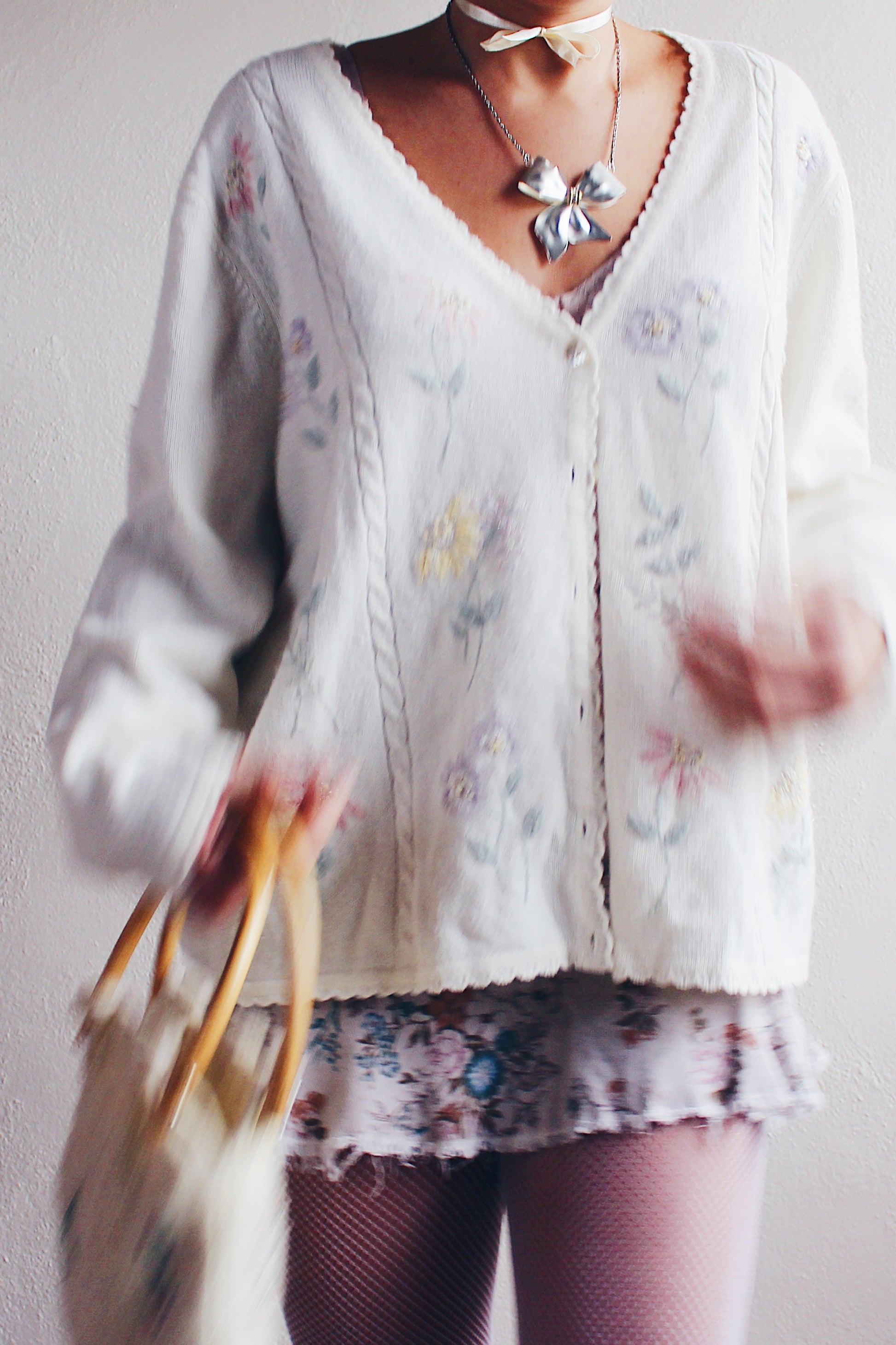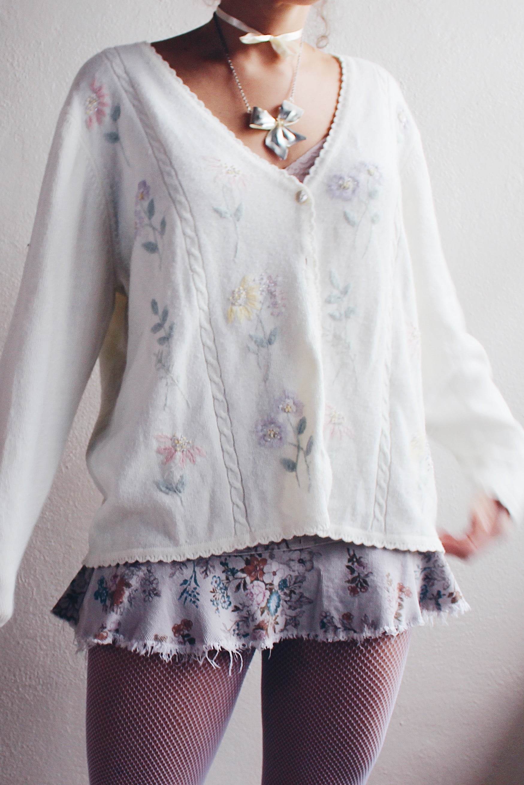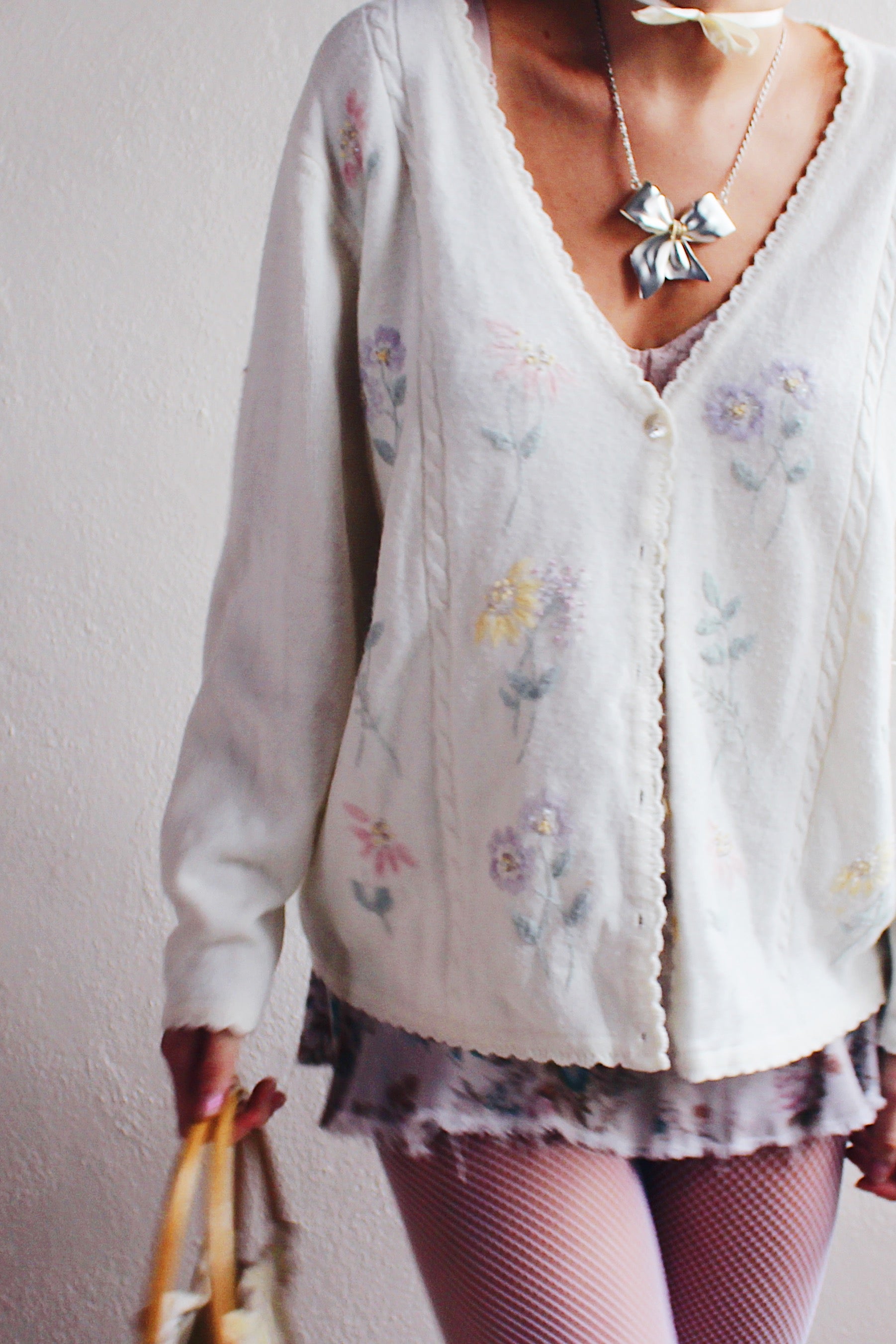 Elevate your style with this charming Vintage Cream Knit Floral Granny Cardigan from the 1980s. Embrace the retro flower power in this cozy and feminine boho sweater, reminiscent of classic grandma chic aesthetics. The intricate floral pattern adds a touch of vintage charm, making it the perfect piece for those who appreciate timeless fashion. Step into the past and make a statement with this unique and cozy grandma-style cardigan. A must-have for lovers of 80s fashion and vintage knitwear, this classic piece is sure to bring warmth and style to your wardrobe.