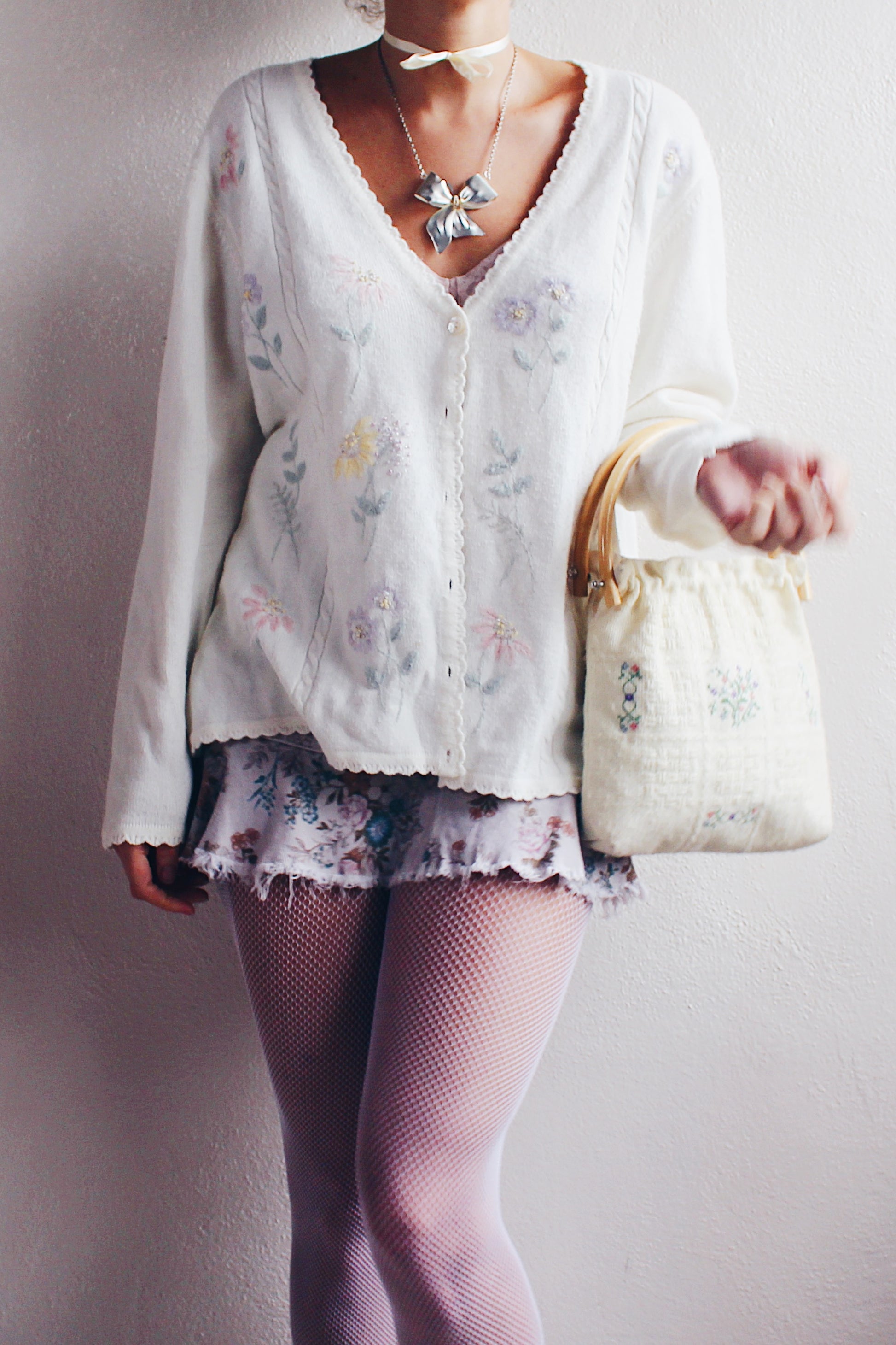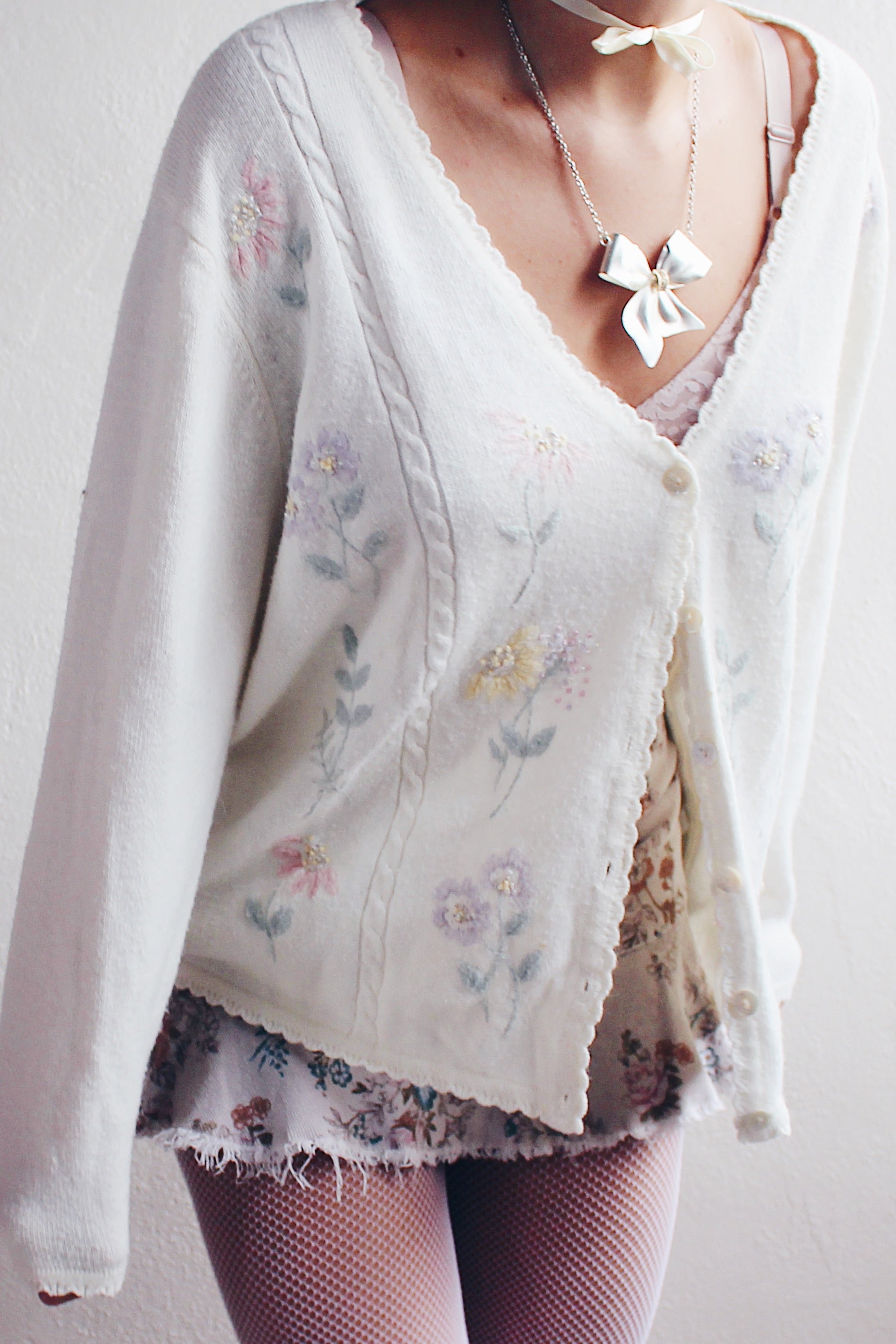Vintage Cream Knit Floral Granny Cardigan | 1980s Retro Flower Sweater | Cozy Grandma Chic